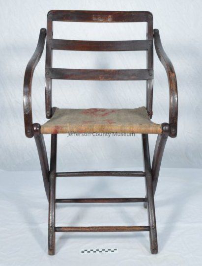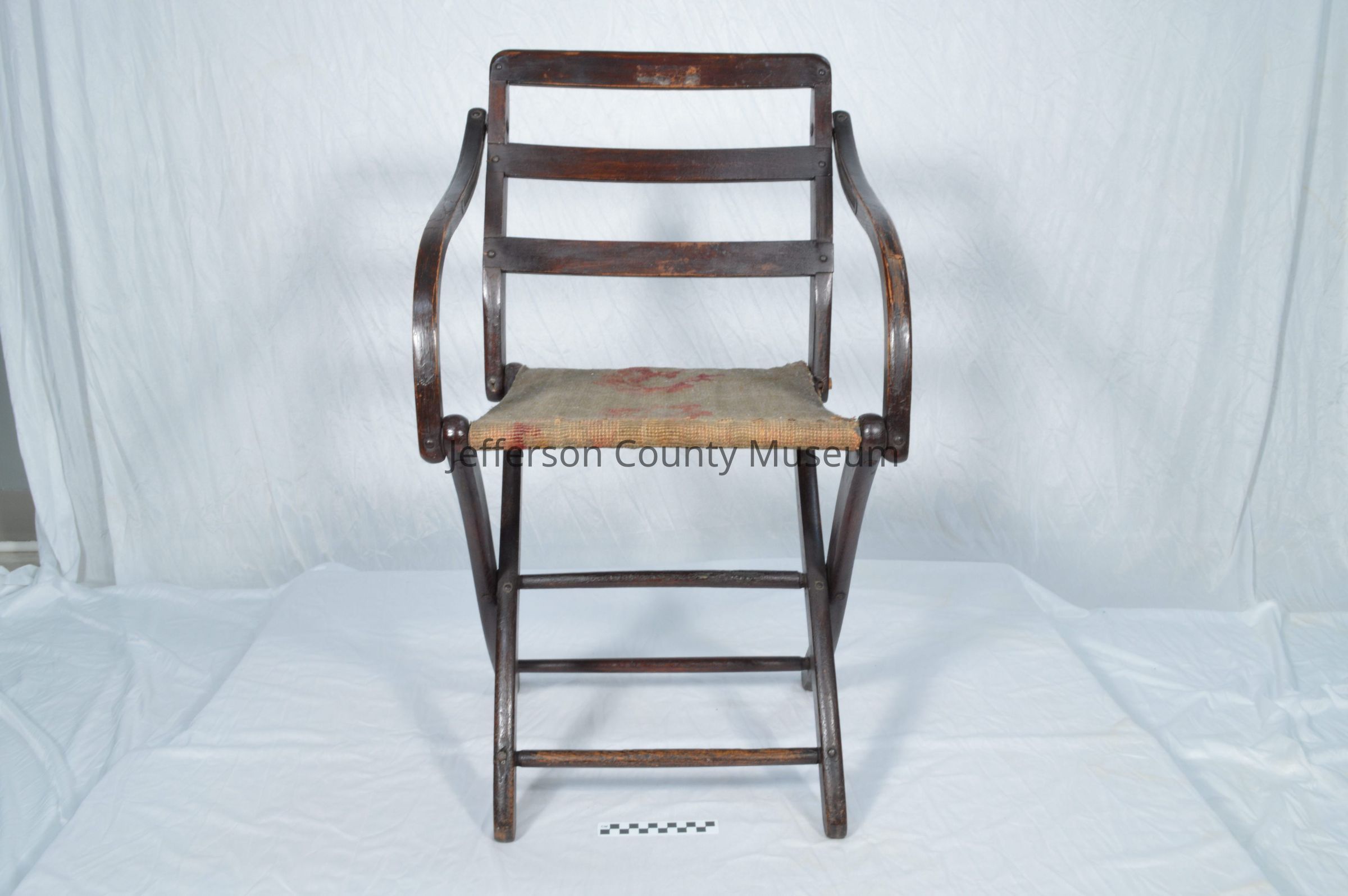Officer's wooden folding camp chair, Civil War era. Constructed with dowels. Seat is burlap with red print that has faded and run.Acquisition