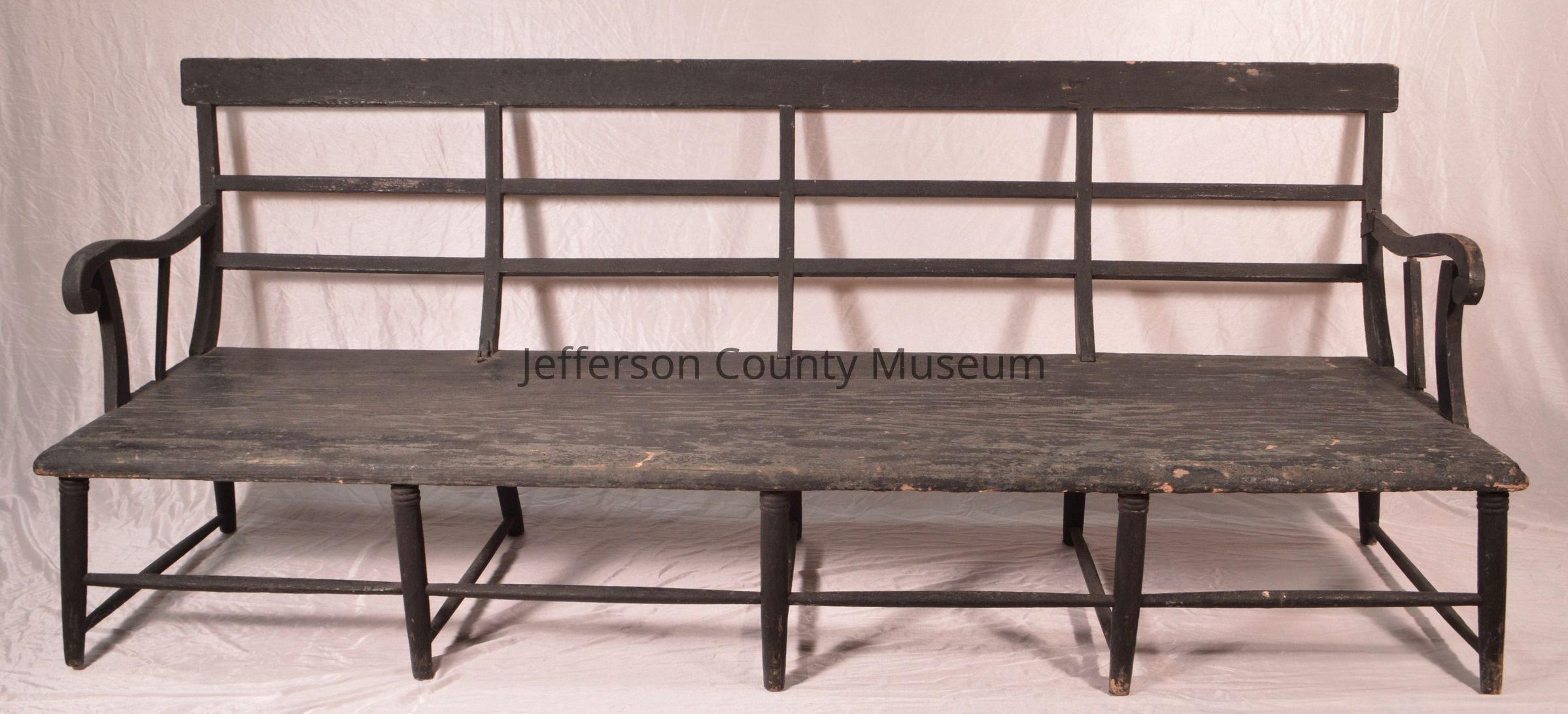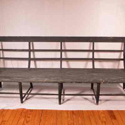 Plank seat wooden bench painted dark green. Ten leg stretcher base, contoured back with double slats below a wide crest rail.Acquisition
