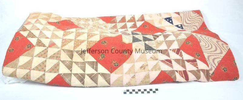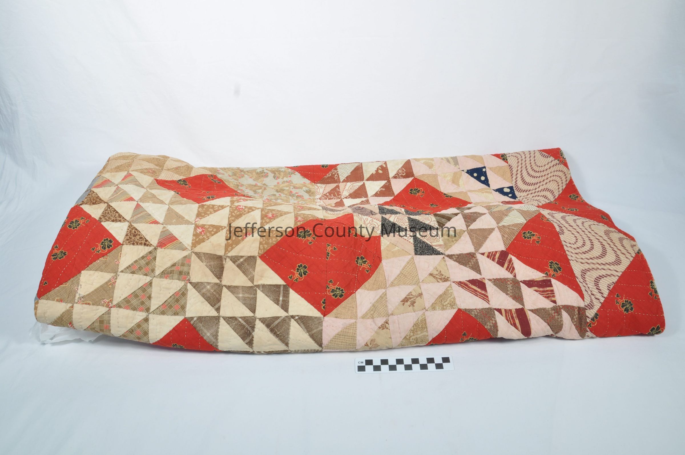 Mostly red, brown and white cotton summer quilt made with small triangular pieces. Border is red with black flowers. Variation of Ocean Waves pattern.Acquisition