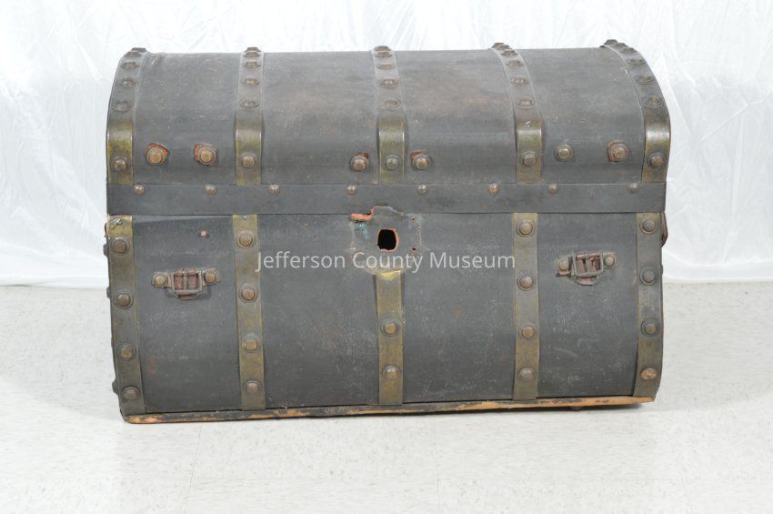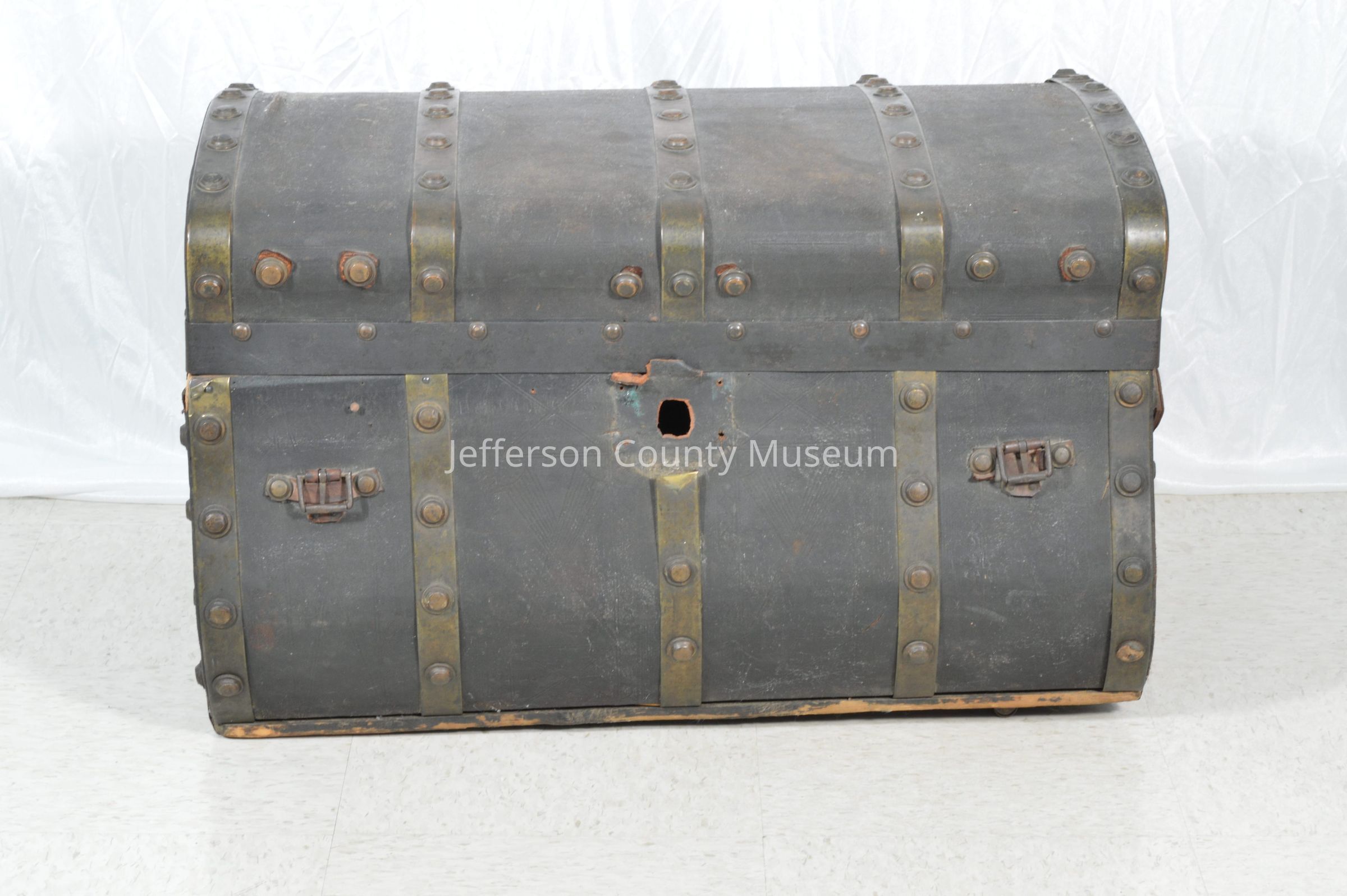 Brass bound, leather covered coach trunk with domed top, pinched at the waist. Brass knobs on the brass straps. One leather handle missing.Acquisition