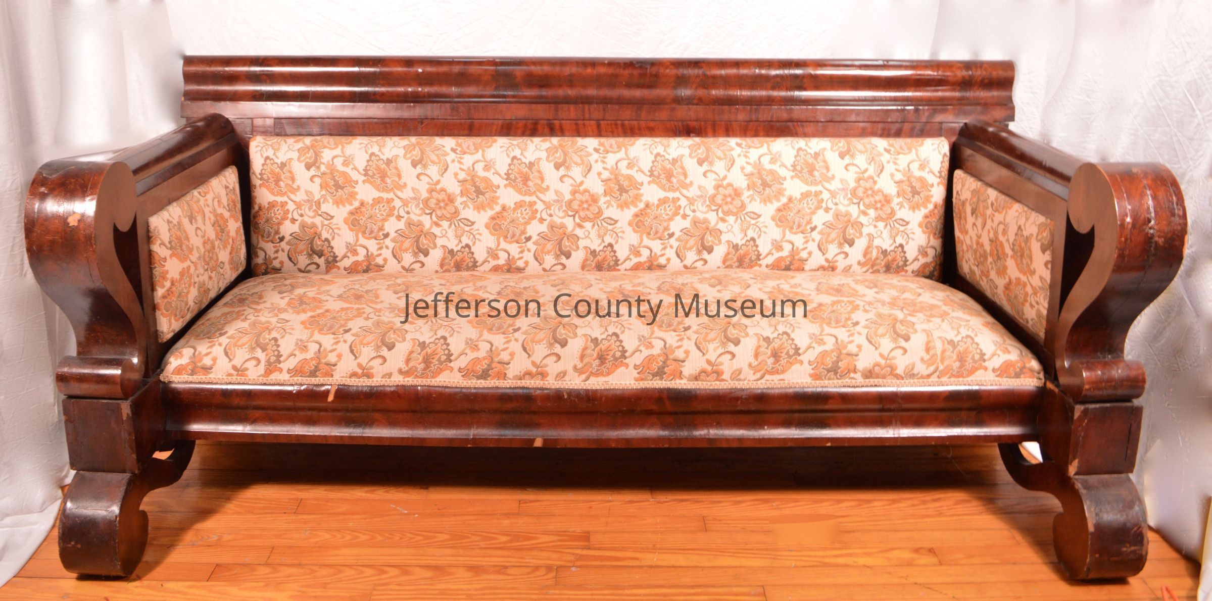 Large sofa with wood veneer covered frame. Very heavy arms and legs. Covered with fabric in green, amber, and off-white.Acquisition