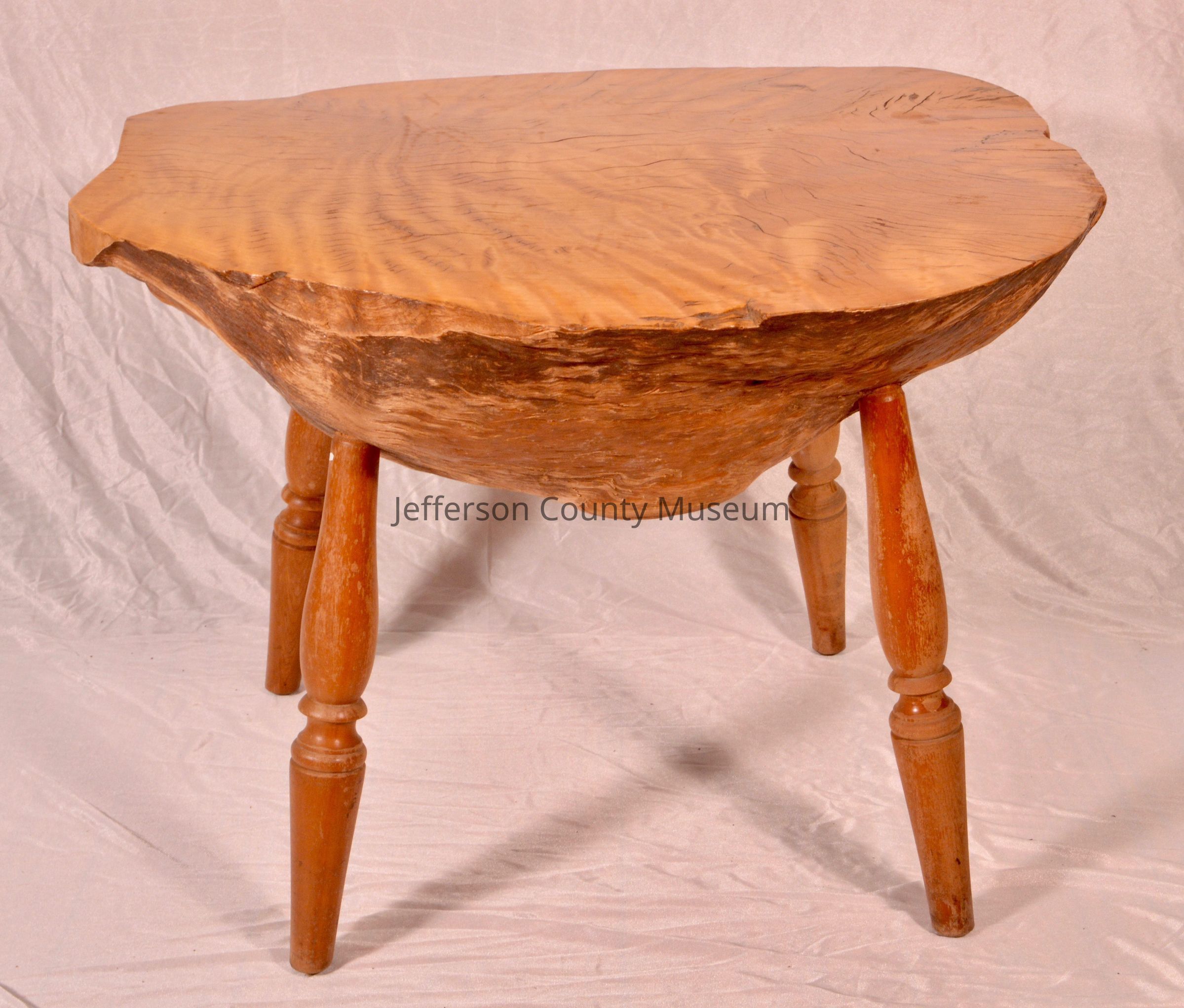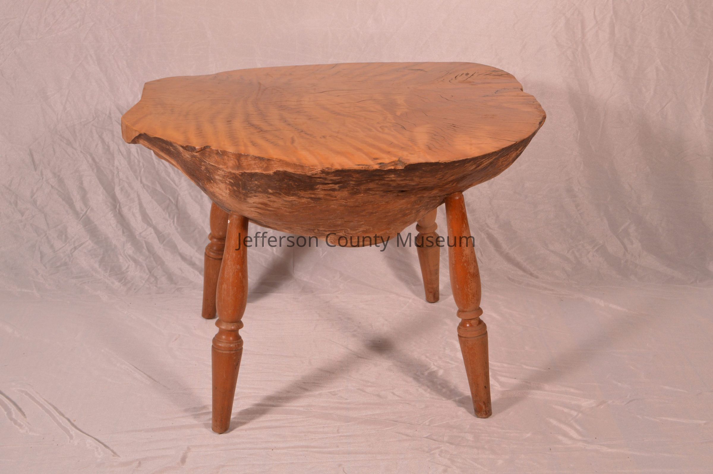 Large burl, possibly cypress, table. Burl was cut in half and finished. Legs are four modern turned legs.Acquisition
