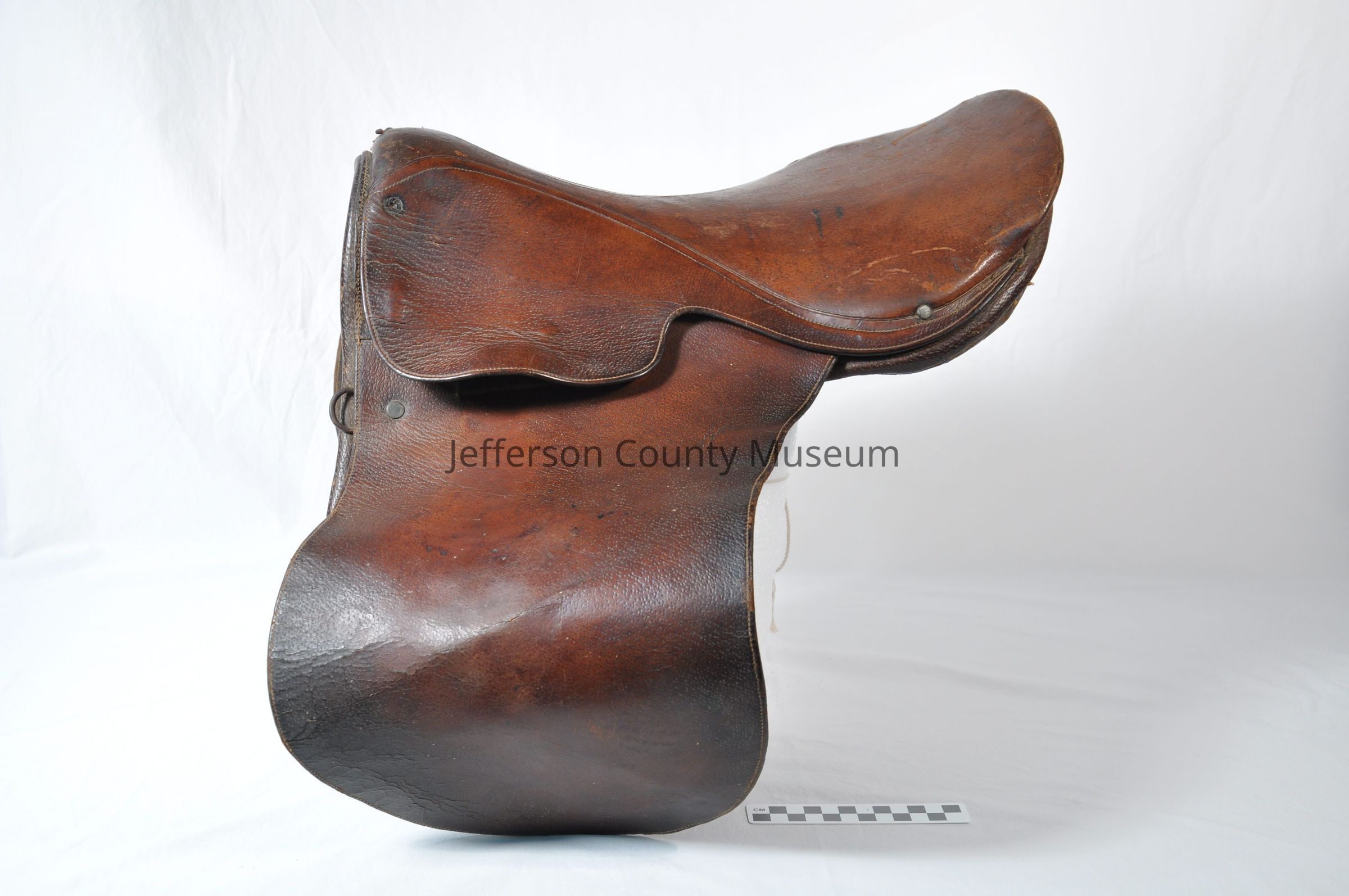 Leather English style pony saddle. Small metal ring on front of saddle, two on back right side.