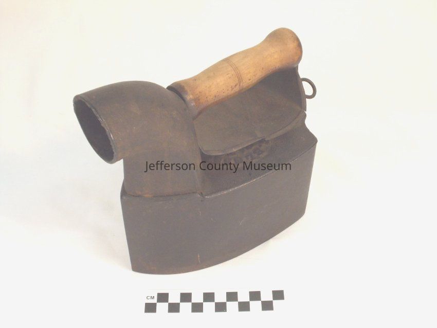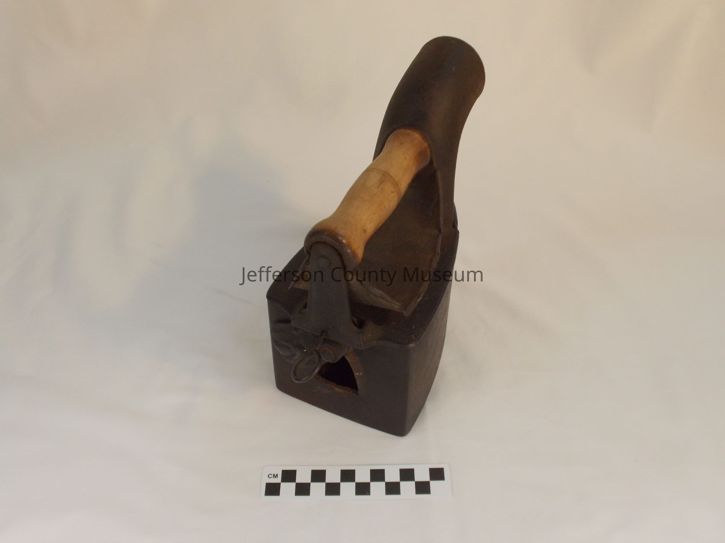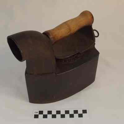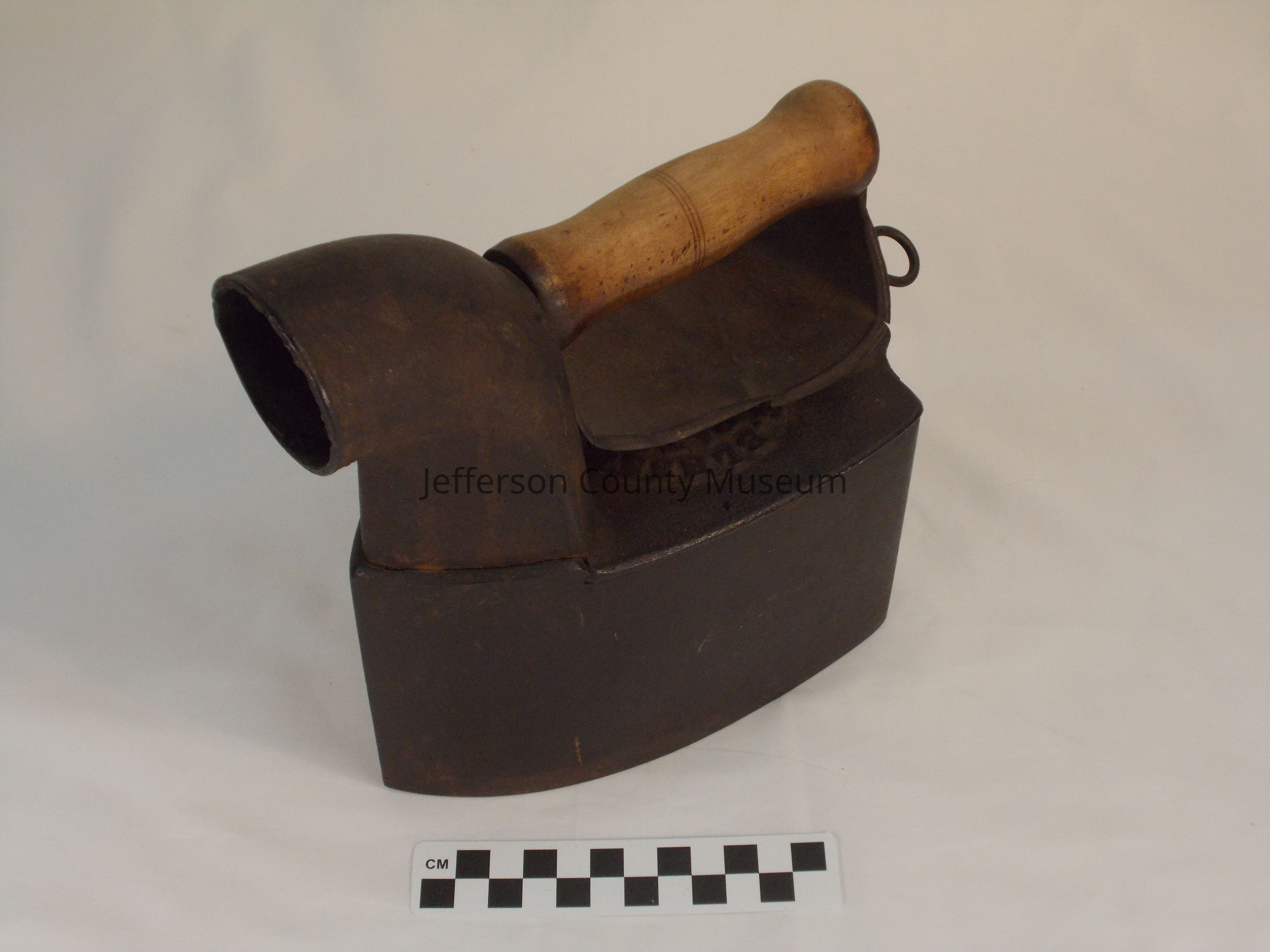 Charcoal iron with large spout or chimney to take smoke away from user. Wooden handle. Small door on back gives air to coals. Name under heat shield "E. BLESS & R. DRAKE PATENTED MARCH 30, 1852".Acquisition