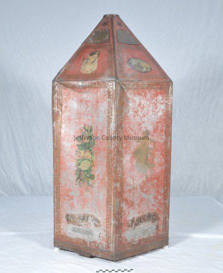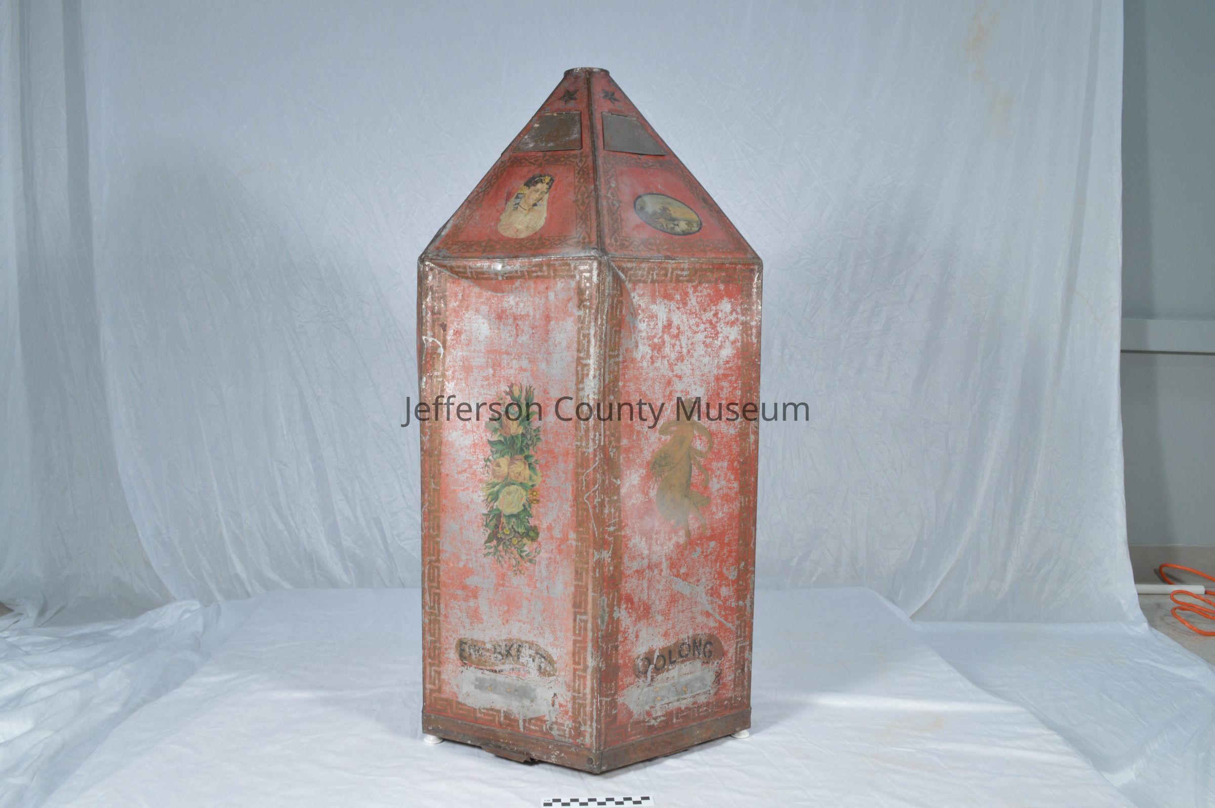 Tin hexagonal commercial tea dispenser painted red with scenes lithographed to it. Scenes include a Chinese or Japanese man and woman, young women, flowers, birds, water scenes and others. Each side of the hexagon has the name of a tea such as "OOLONG" at the bottom. Top of each hexagon has a tin flap that opens to pour in loose tea. Each hex. at bottom has a tin flap that slides out to dispense tea. Three white porcelain legs or knobs on bottom. On two sides "A.S. Everhart & Co. SOLE AGENTS FOR W. M. Hoyt & Cos. REVOLUTION CANISTER TEAS".Acquisition