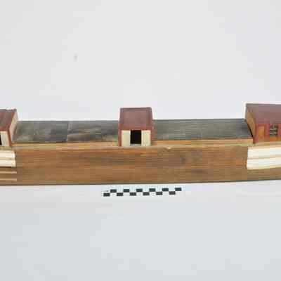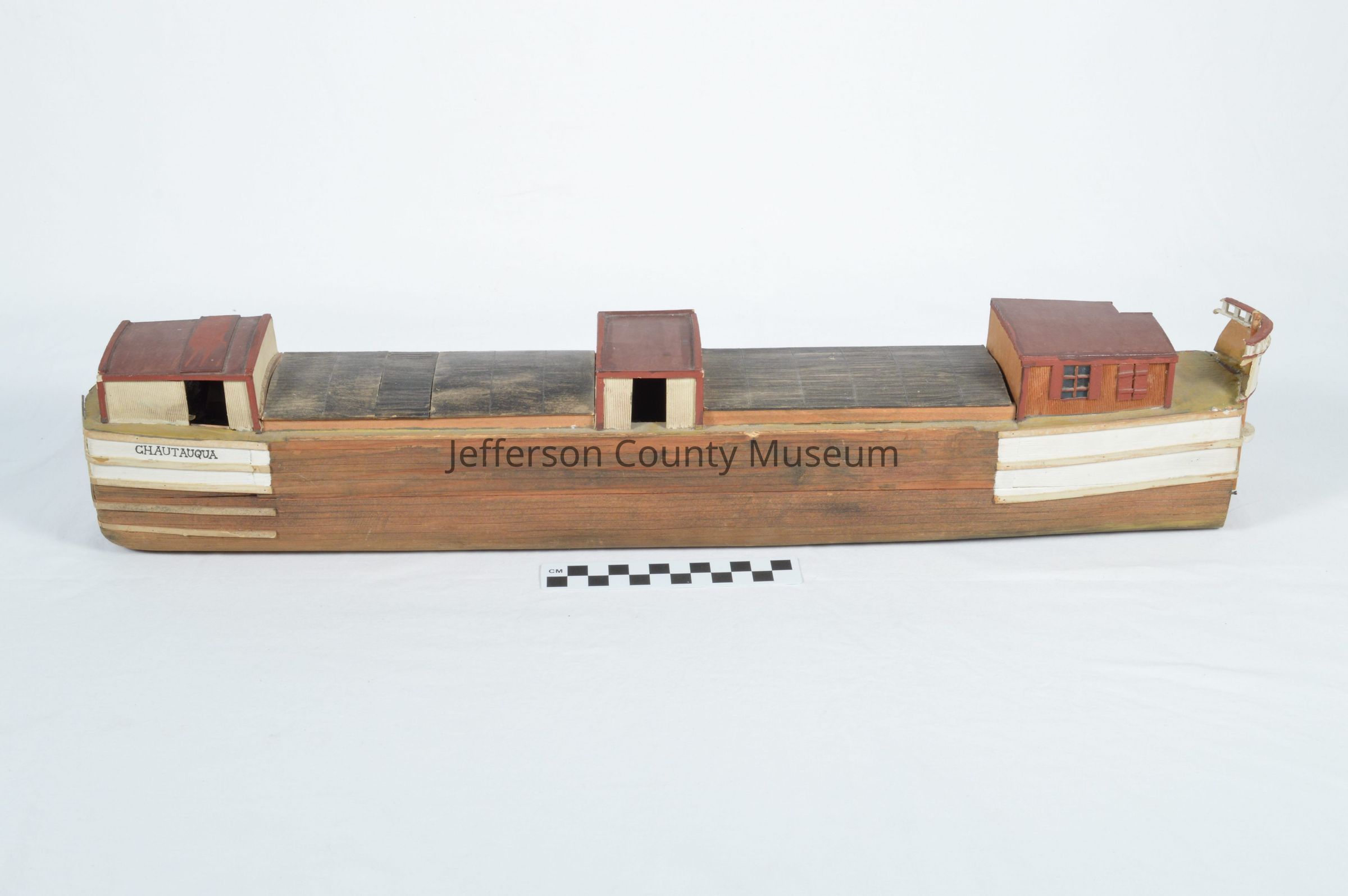 Model of Chesapeake & Ohio Canal boat. Model is accurate in detail with three cabins. Front cabin was for mules, center cabin for hay storage and back cabin for captain's family. Cabins are painted with red roofs, hatch covers are black, front and rear top part of hull is painted white. Boat name "CHAUTAUQUA" is painted on front of boat on both sides. On back of boat in black paint is "CANAL TOWAGE Co No60". On bottom of boat is written in black marker "DO NOT FLOAT: MADE WITH WATER SOLUABLE (sic) GLUE".Acquisition