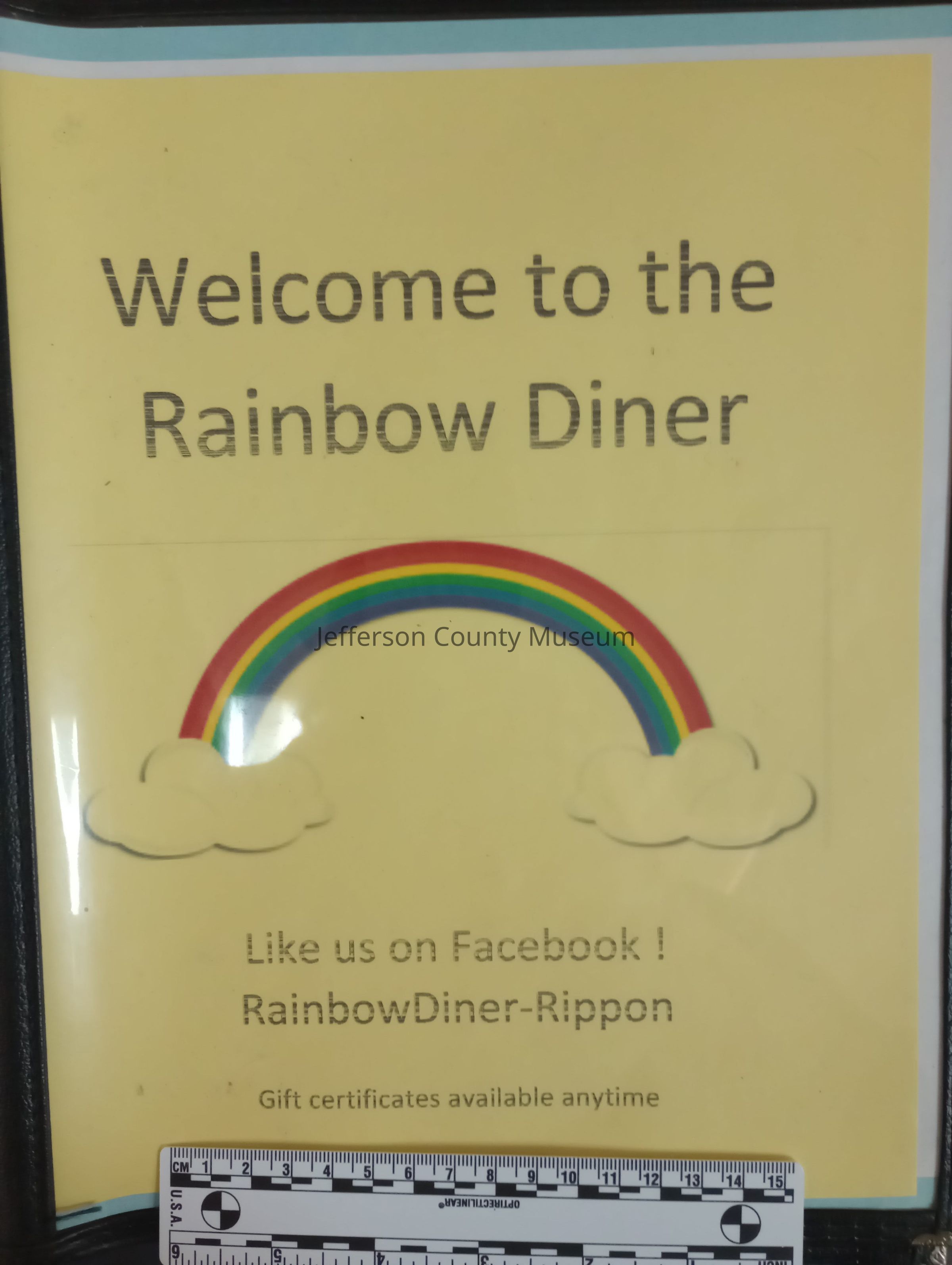 Menu from the Rainbow Diner with yellow cover, four pager front and back.Context