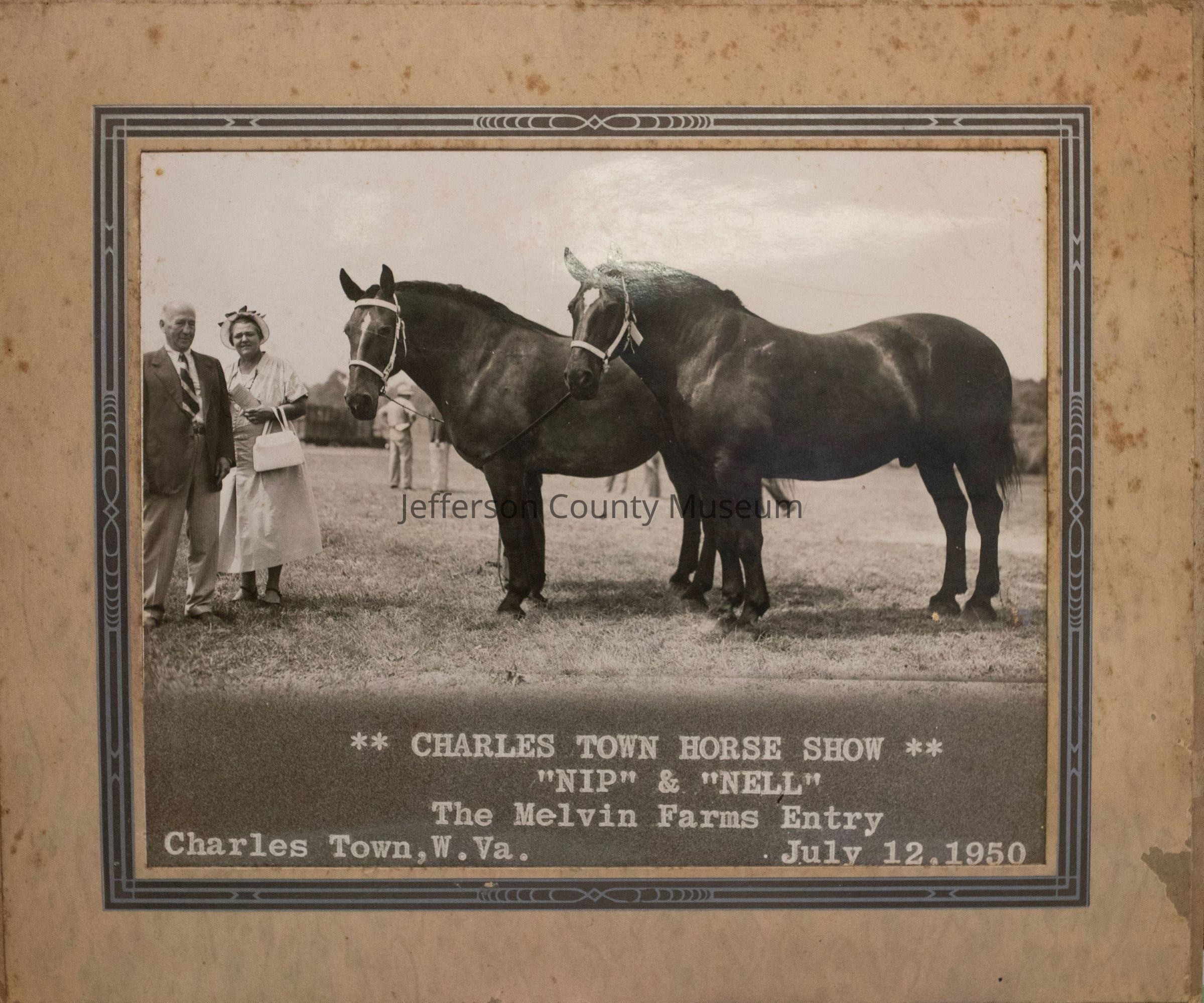 Black and white mounted winners circle photo from the Charles Town Horse Show of "Nip" & "Nell", the Melvin Farms Entry. A handwritten note on the back identifies the woman in the photo as Meta Jenkins Melvin, wife of Dr. Melvin.Acquisition