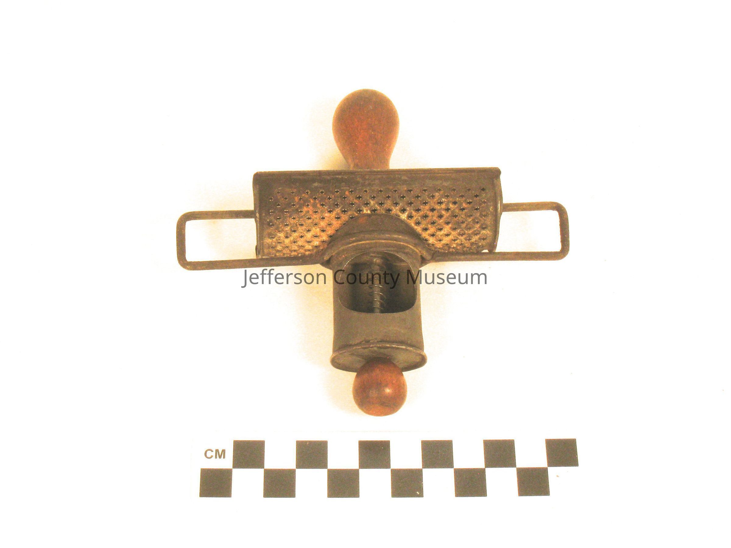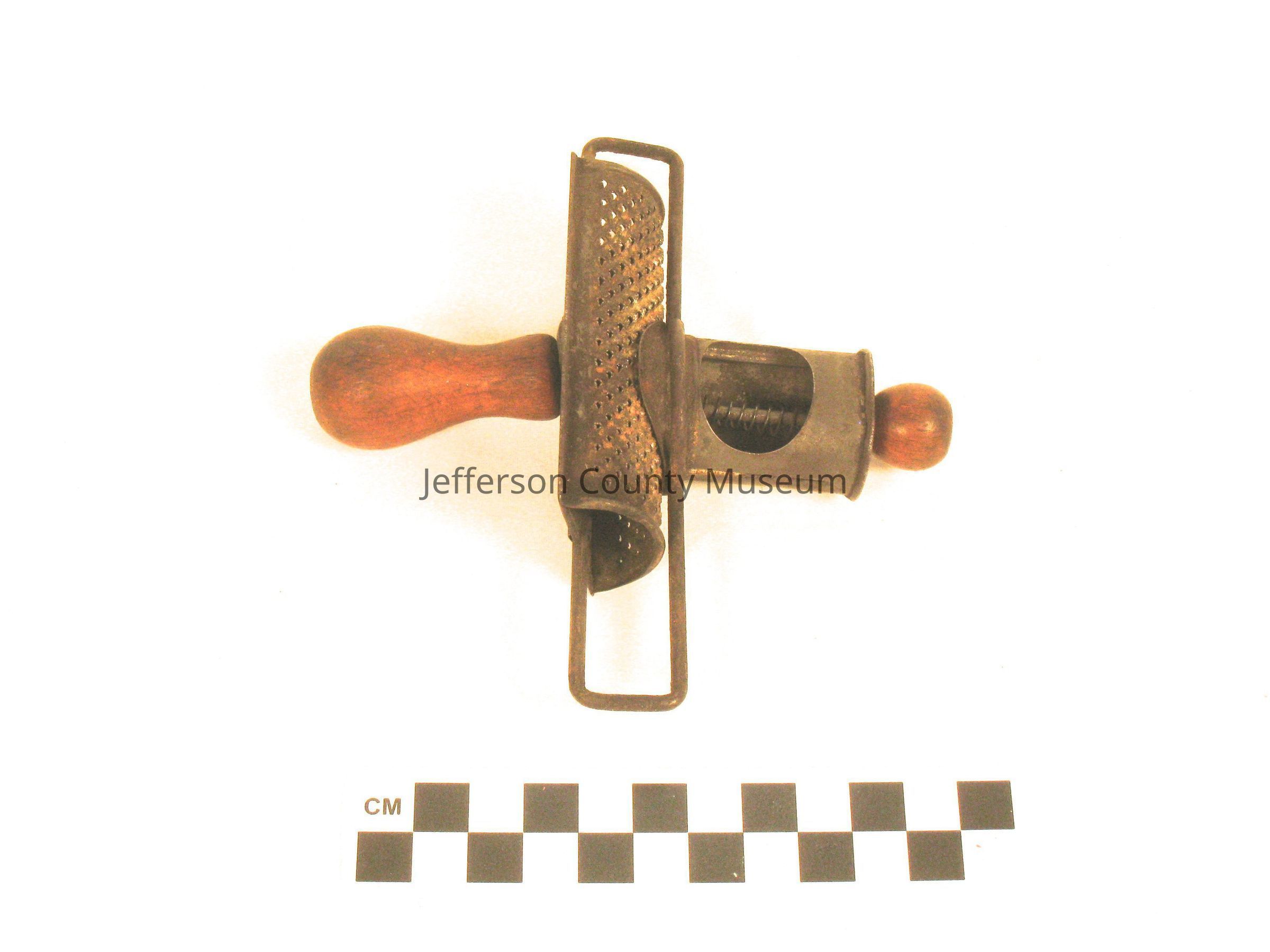 Nutmeg grater, tin and wood. Spring-loaded chamber for nutmeg. Grater slides back and forth on thin rod to get full effect.Acquisition