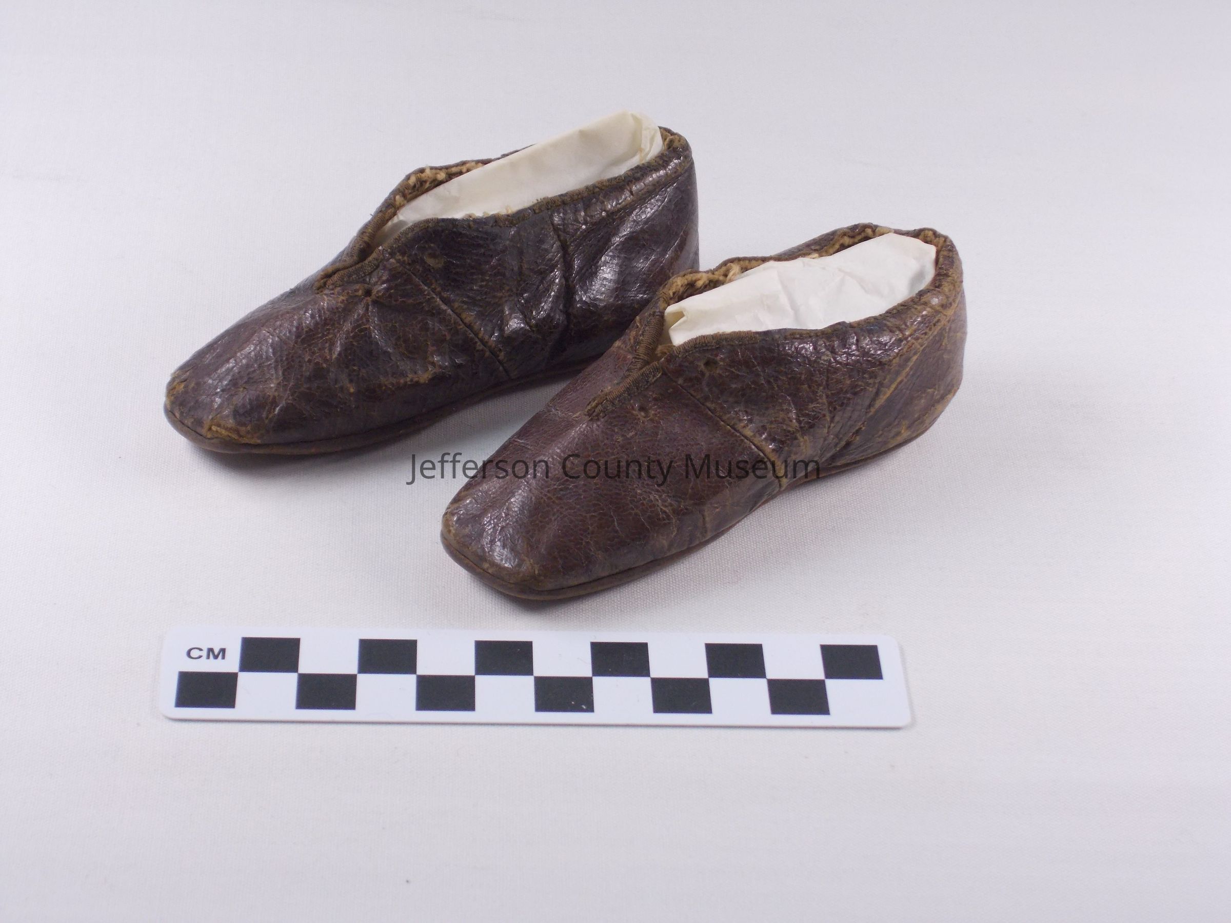 One pair of brown leather children's shoes. Made for laces but laces are missing.