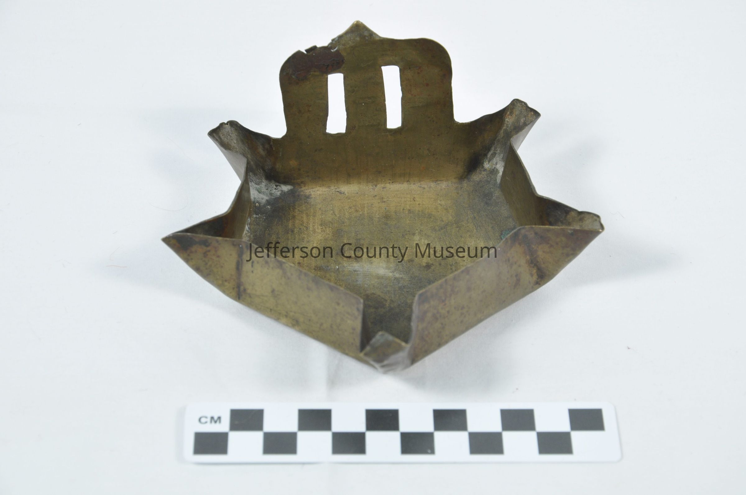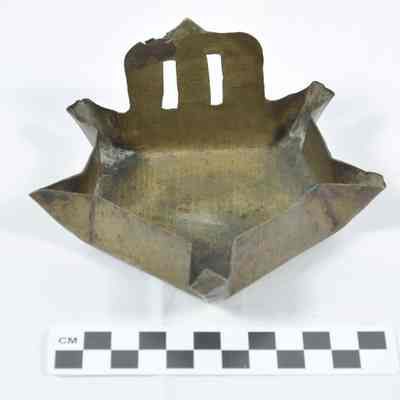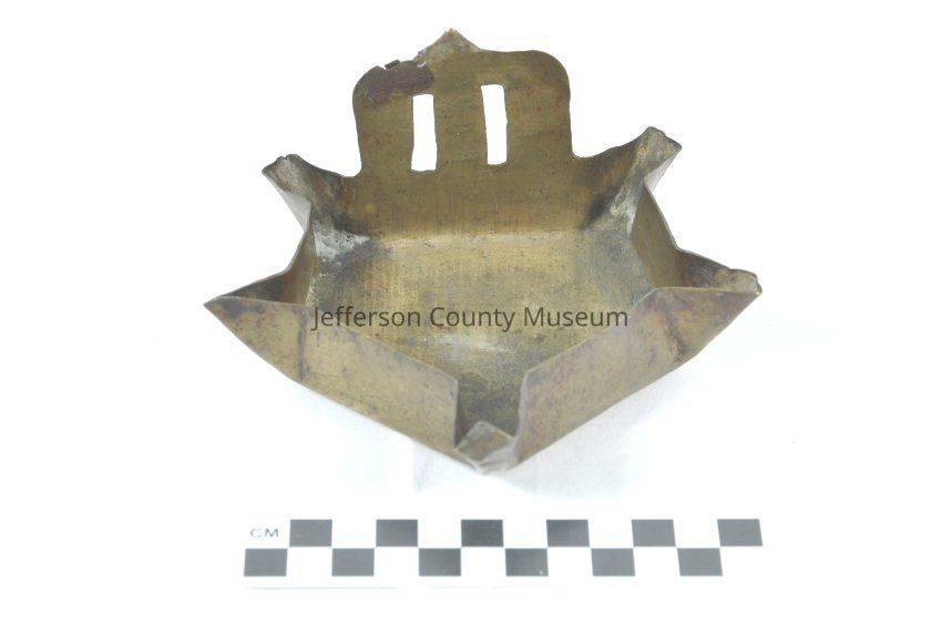 Fat lamp. One piece of brass formed into nearly a star shape. Where sixth point would be is folded up for a handle with two rectangular slots.Acquisition