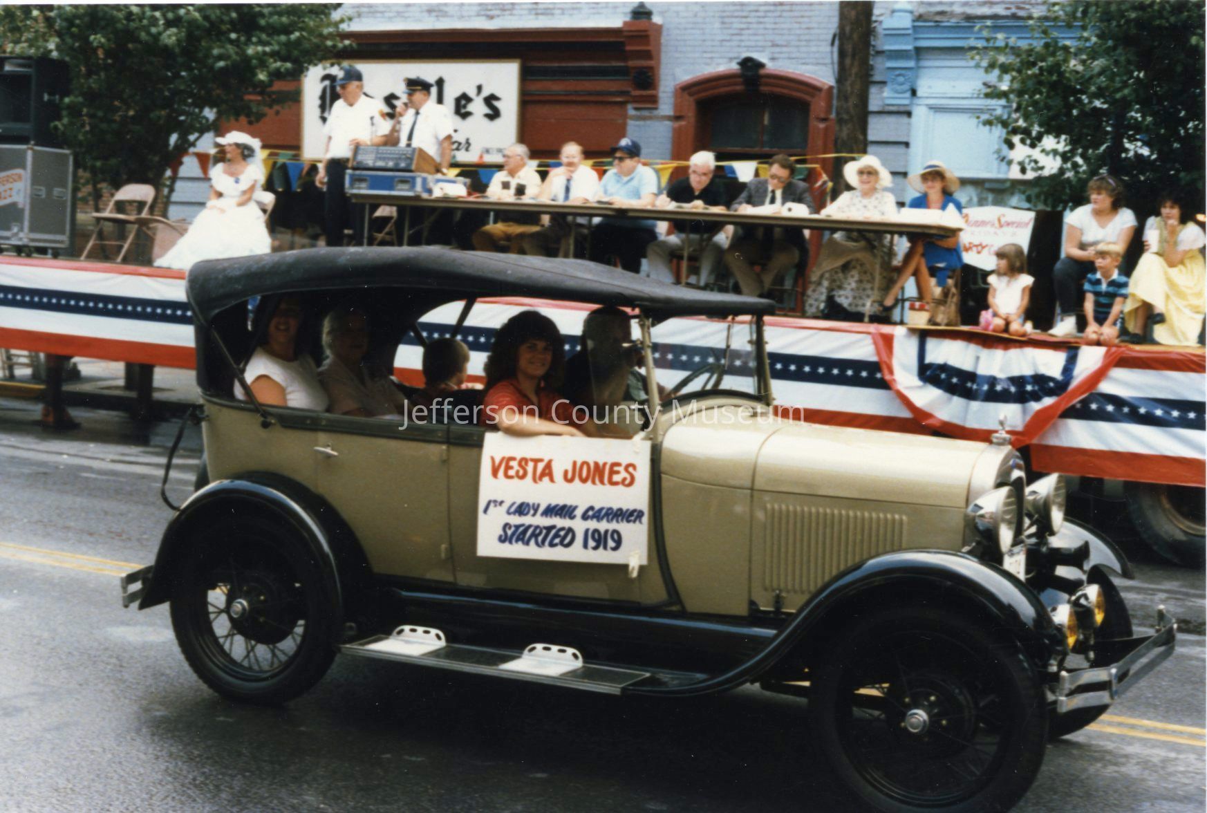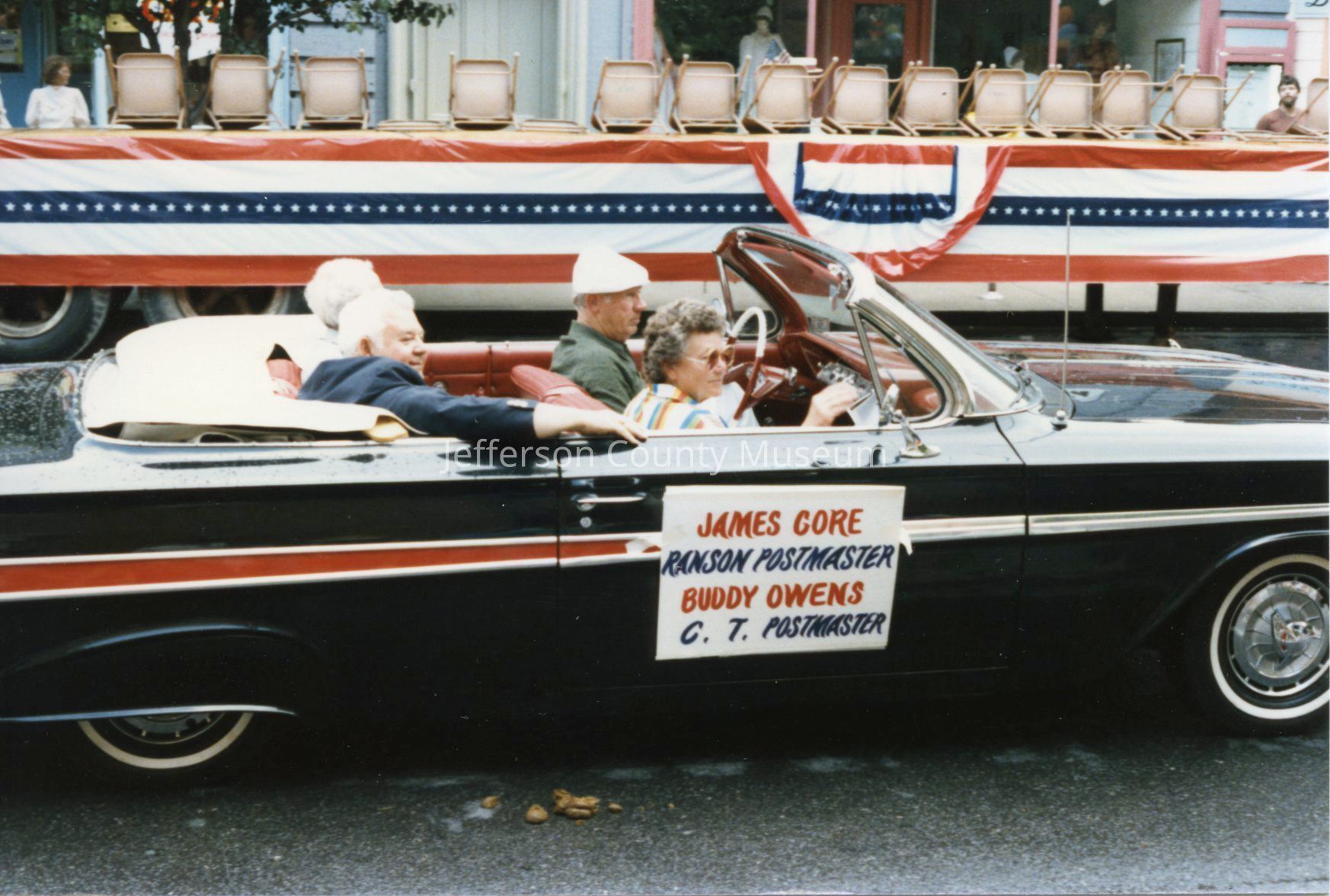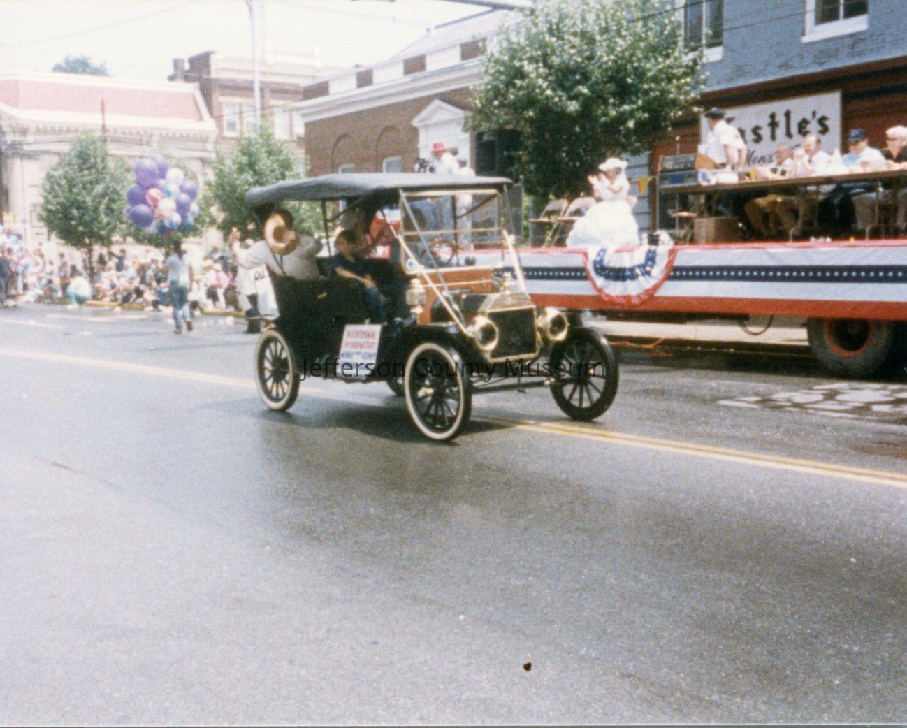 Several photos have signs on the side of the cars announcing who is riding in the car: