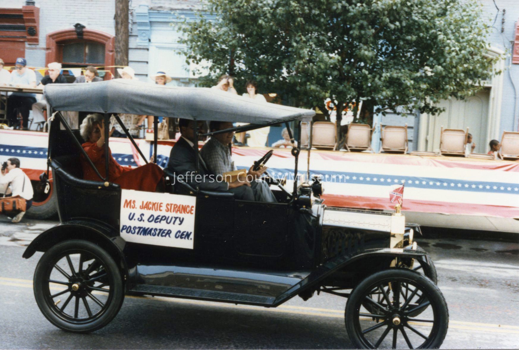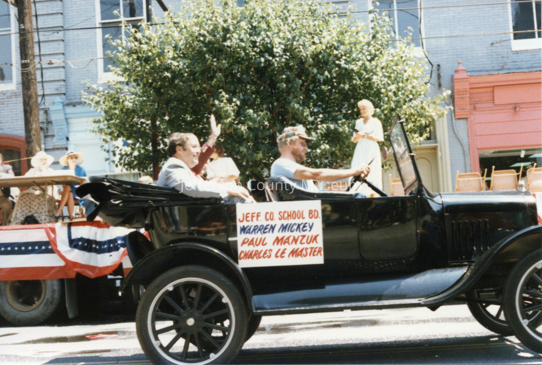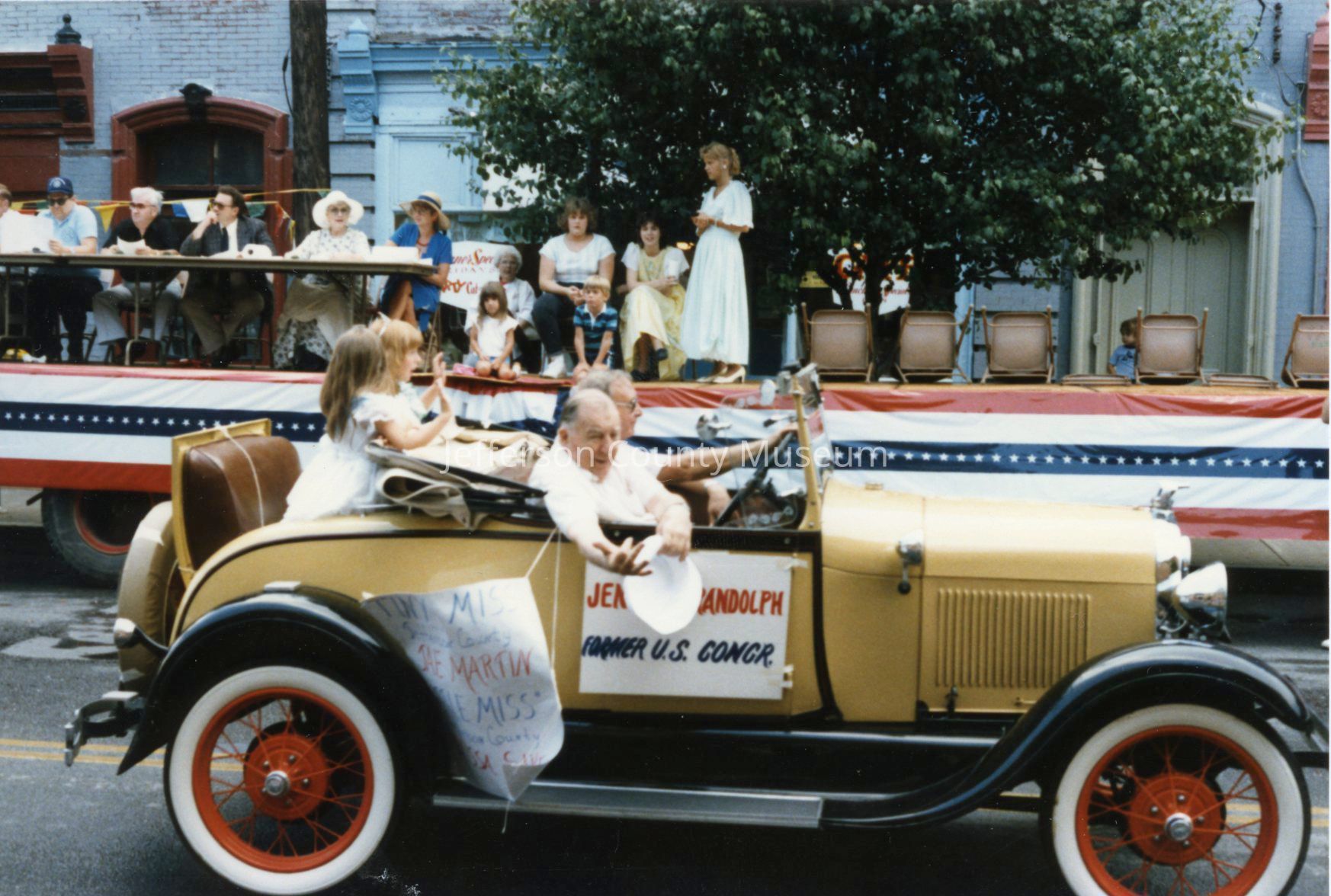 Several photos have signs on the side of the cars announcing who is riding in the car: