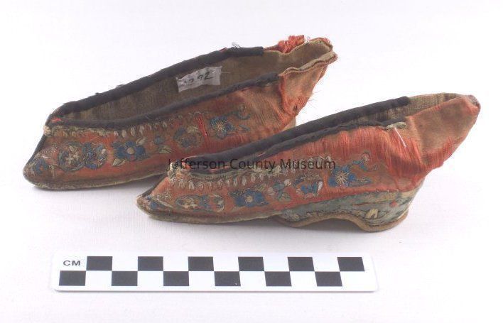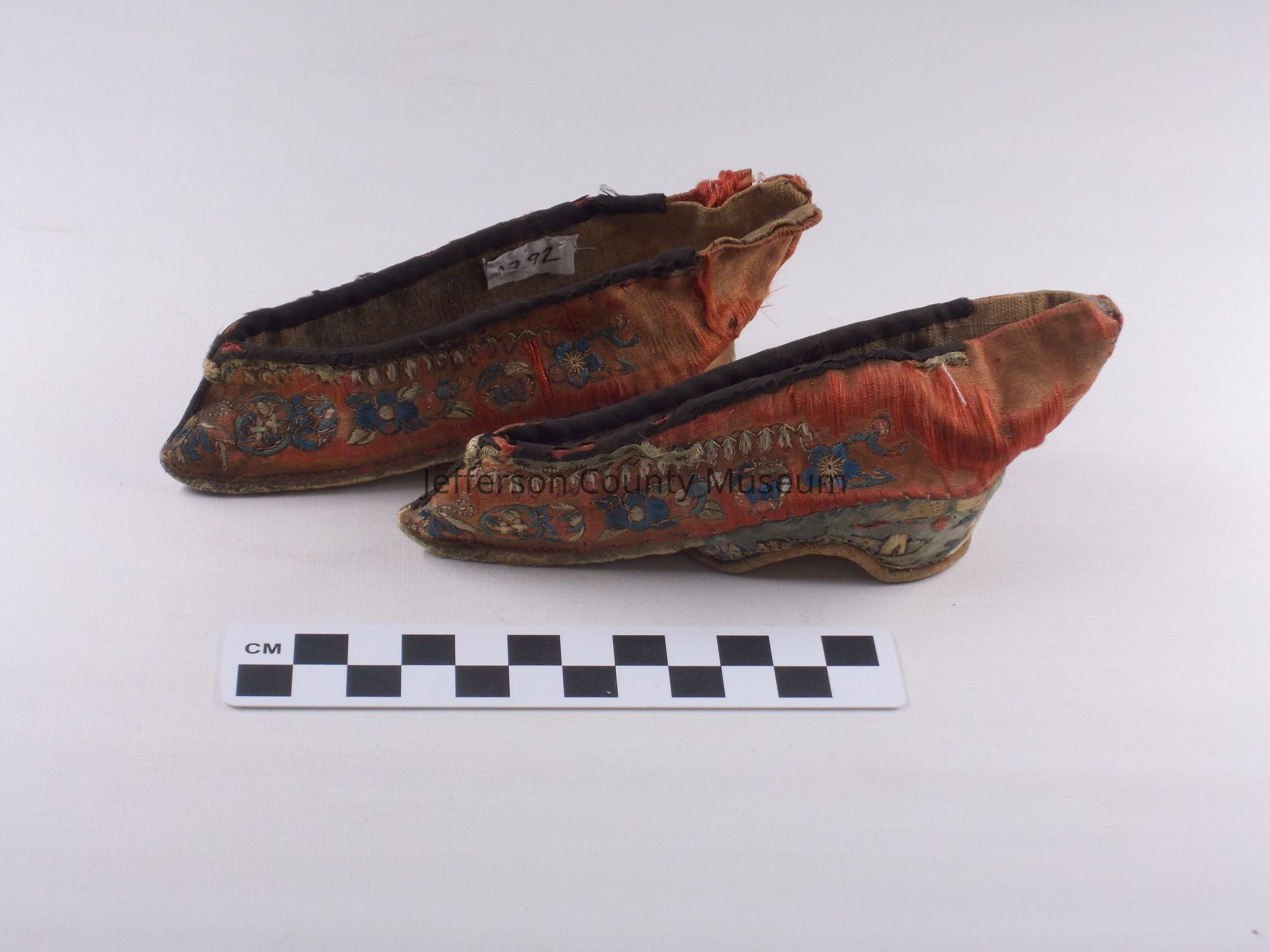 Early 20th century pair of silk embroidered Chinese slippers. Multi-colored silks on red background.Acquisition
