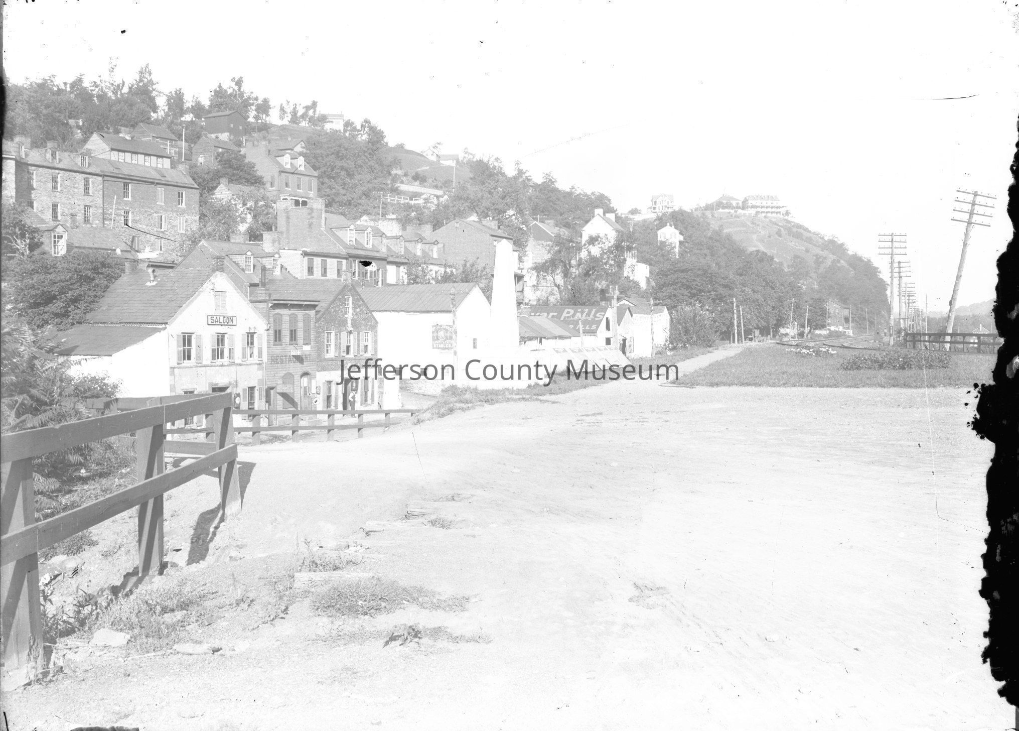 View of lower town Harpers Ferry from the old armory grounds. In 1892 the B&O Railroad acquired a right-of-way across the old armory grounds from Thomas E. Savery and constructed a 20 foot high bank to support its tracks. This photograph is taken near the newly constructed passenger station. Seen on the left along Potomac Street are various shops including the White Horse Saloon. Houses which are part of Marmion Row are shown in the upper left. In the foreground is the granite obelisk placed by the railroad in 1895 to mark the original location of the armory fire engine and guard house, which is better known as John Brown's Fort. Also visible are five battle markers placed in 1892 by the Antietam Battlefield Board which explain the relationship of the capture of the Union garrison at Harpers Ferry by Confederate troops under General Thomas J. Jackson on September 15-16, 1862 just before the Battle of Sharpsburg (MD) on September 17, 1862. The Hilltop House Hotel is visible in the upper right corner.Acquisition