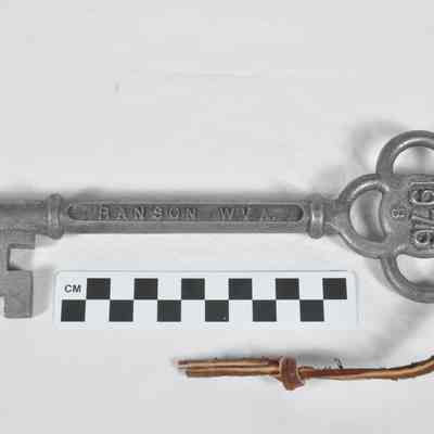 Metal presentation key. One side marked "RANSON W.VA. 1976 B". Other side "1776 B". Leather thong attached.