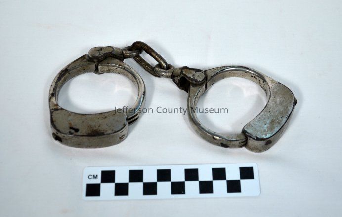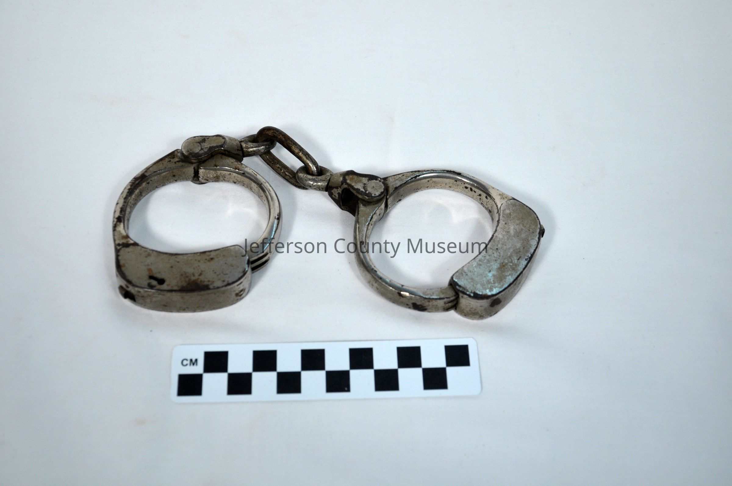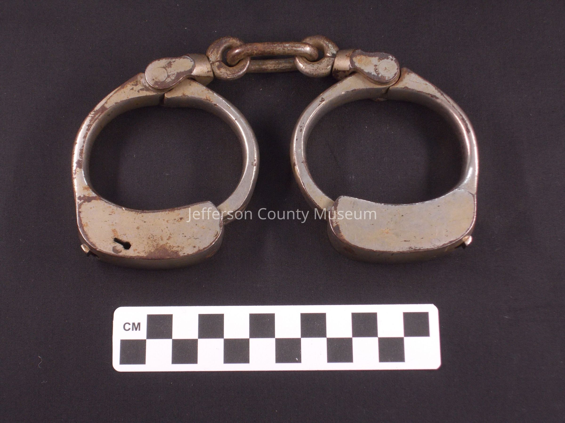 Nickeled handcuffs linked by rings and one heavy chain link. The letter "Y" stamped onto one of the connectors to the cuff.Acquisition
