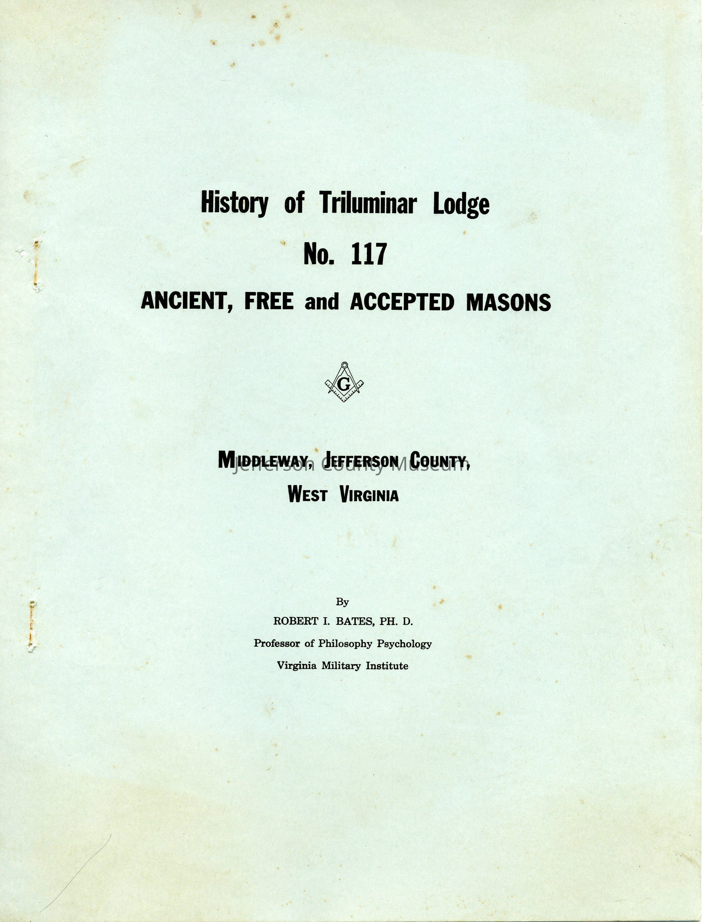 History of Triluminar Lodge No. 117 Ancient, Free and Accepted Masons. Middleway, Jefferson County, West Virginia. Includes some history of the Masons in general and some history of the Middleway area from 1755 through 1970, along with names of members and past masters of the Triluminar Lodge.