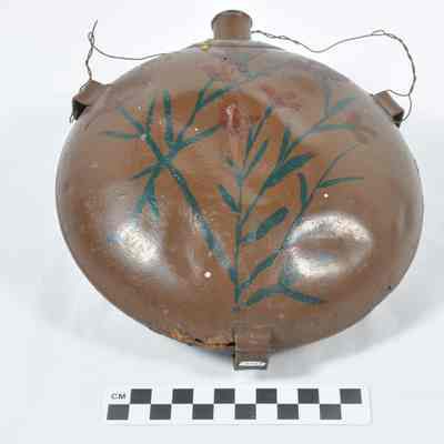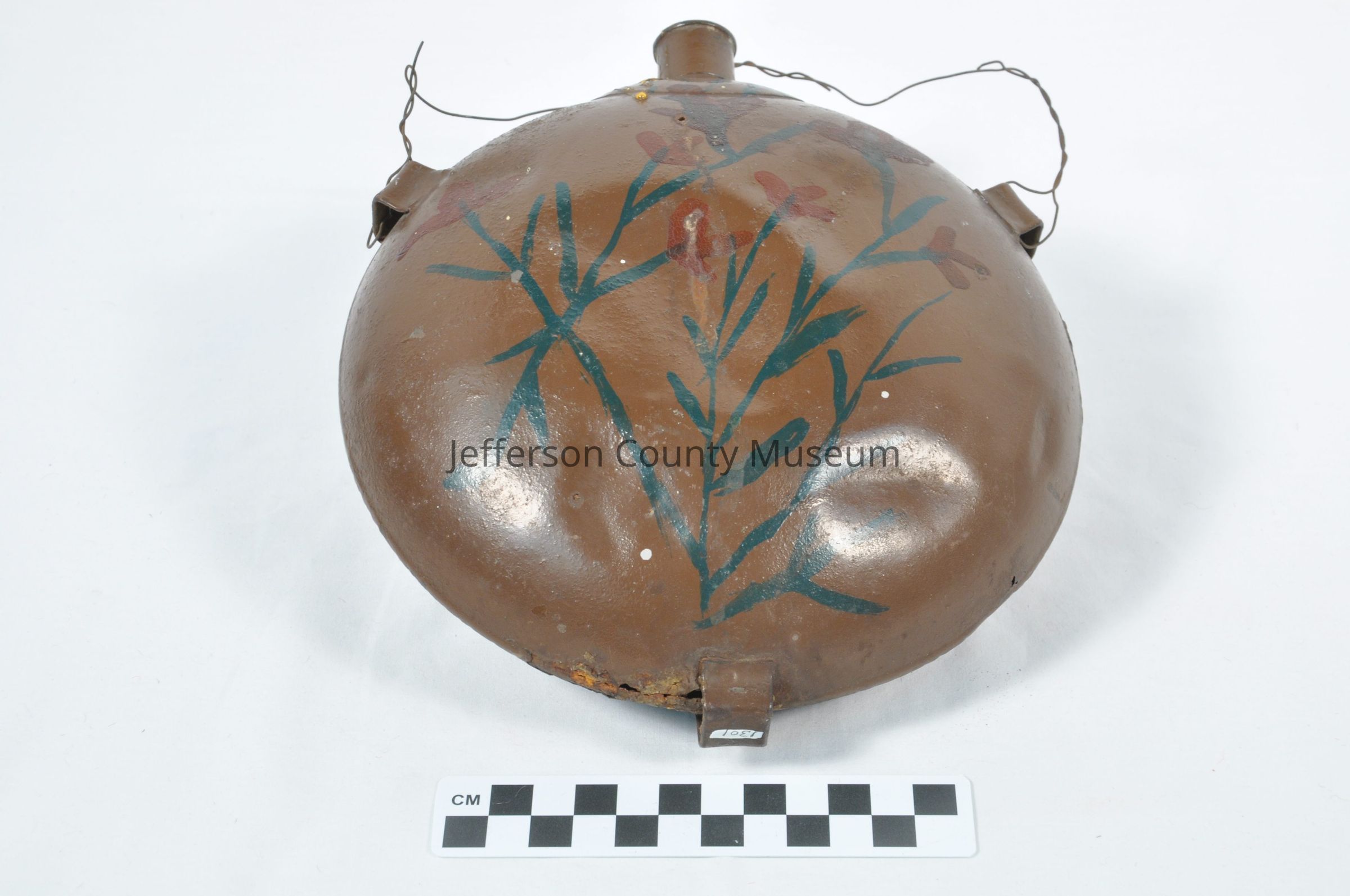Metal Civil War canteen, later painted with green and red flowers. Wire attached to strap keepers.Acquisition