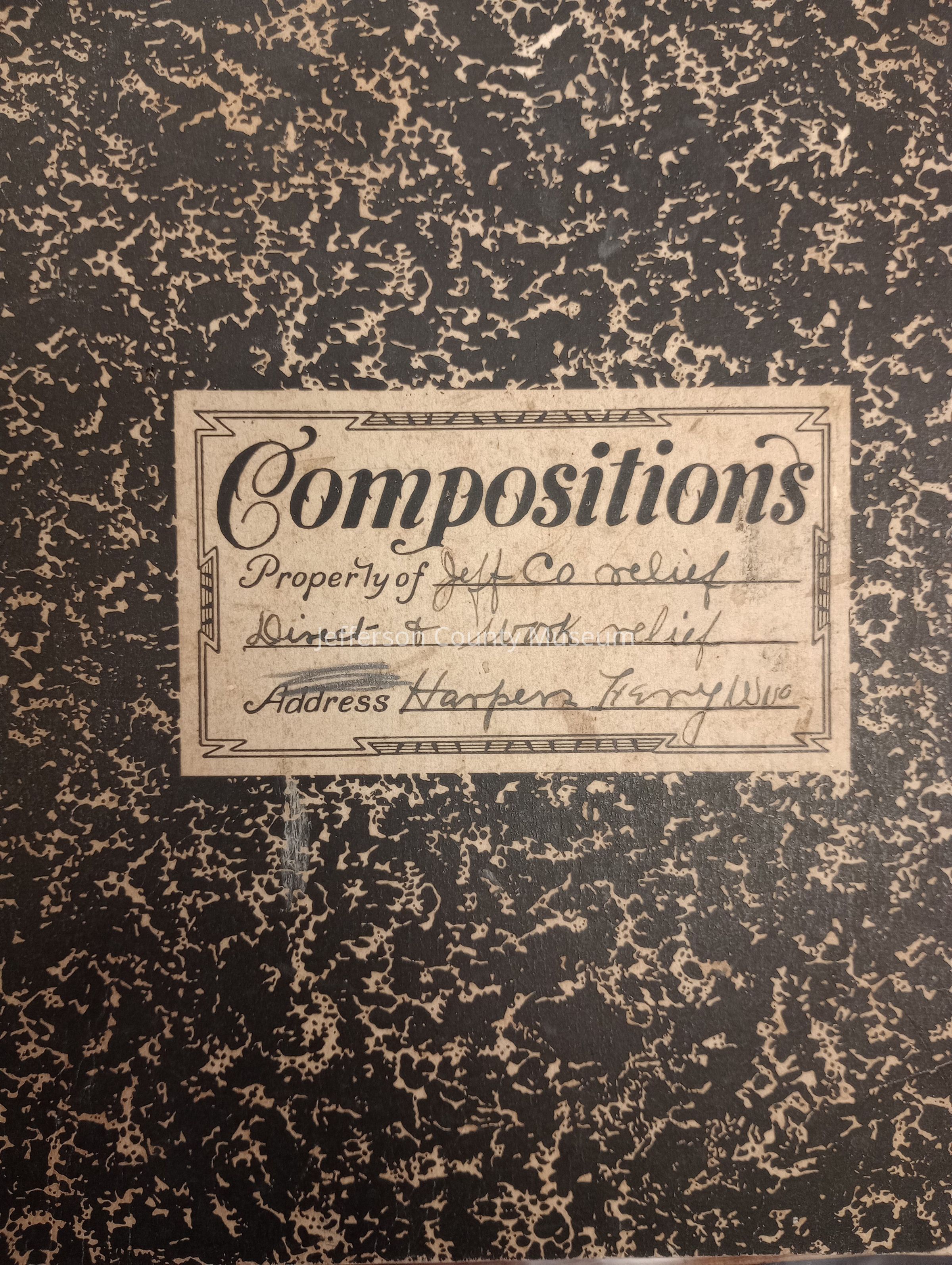 Composition notebook entitled "Jefferson County Relief Direct & Work Relief" containing a handwritten record of relief payments made during the Great Depression to Harpers Ferry residents, including sums, veteran status, and descriptions of why individuals are receiving relief. Some pages contain practice writing by a child, likely Jay Eackles.Acquisition