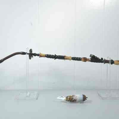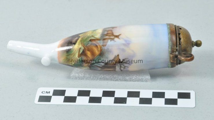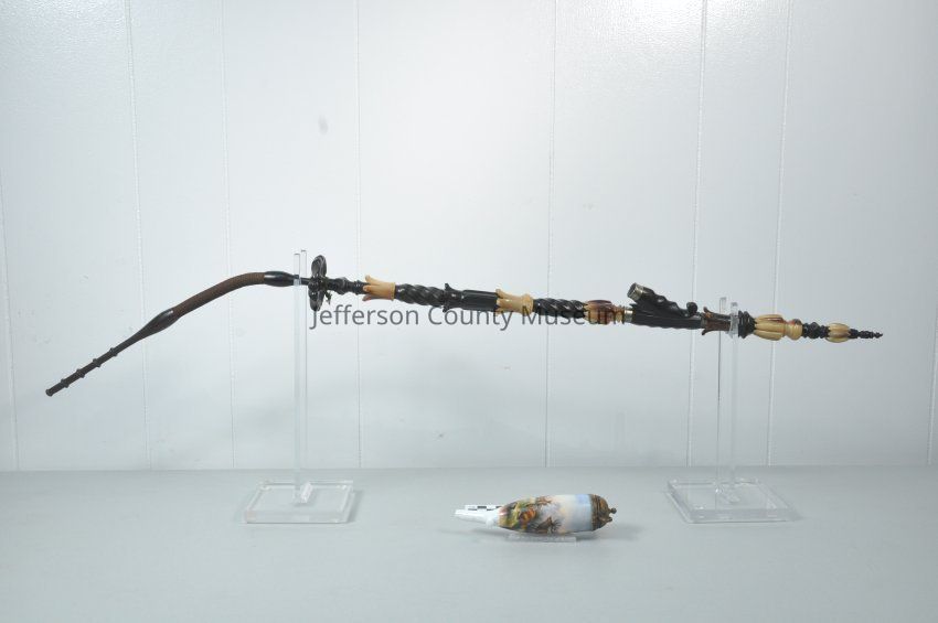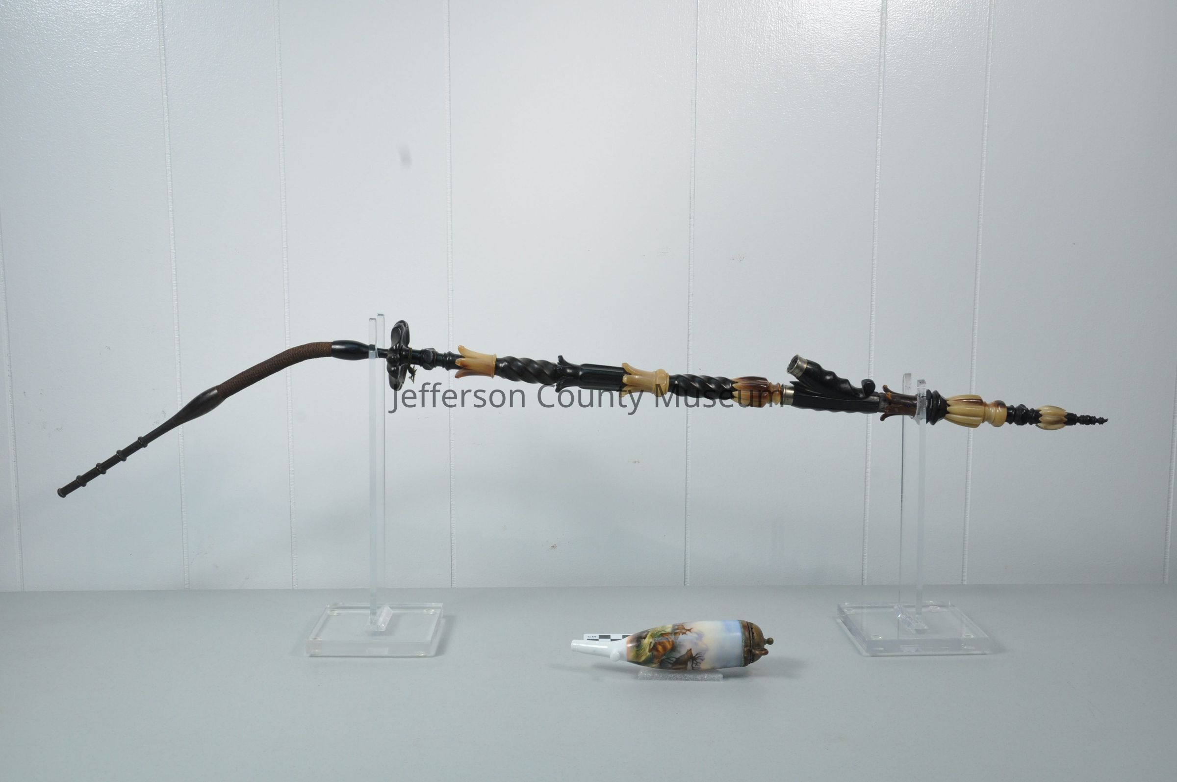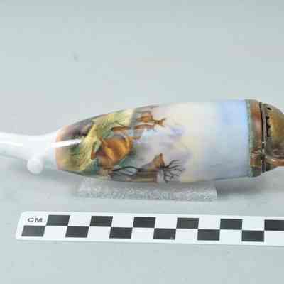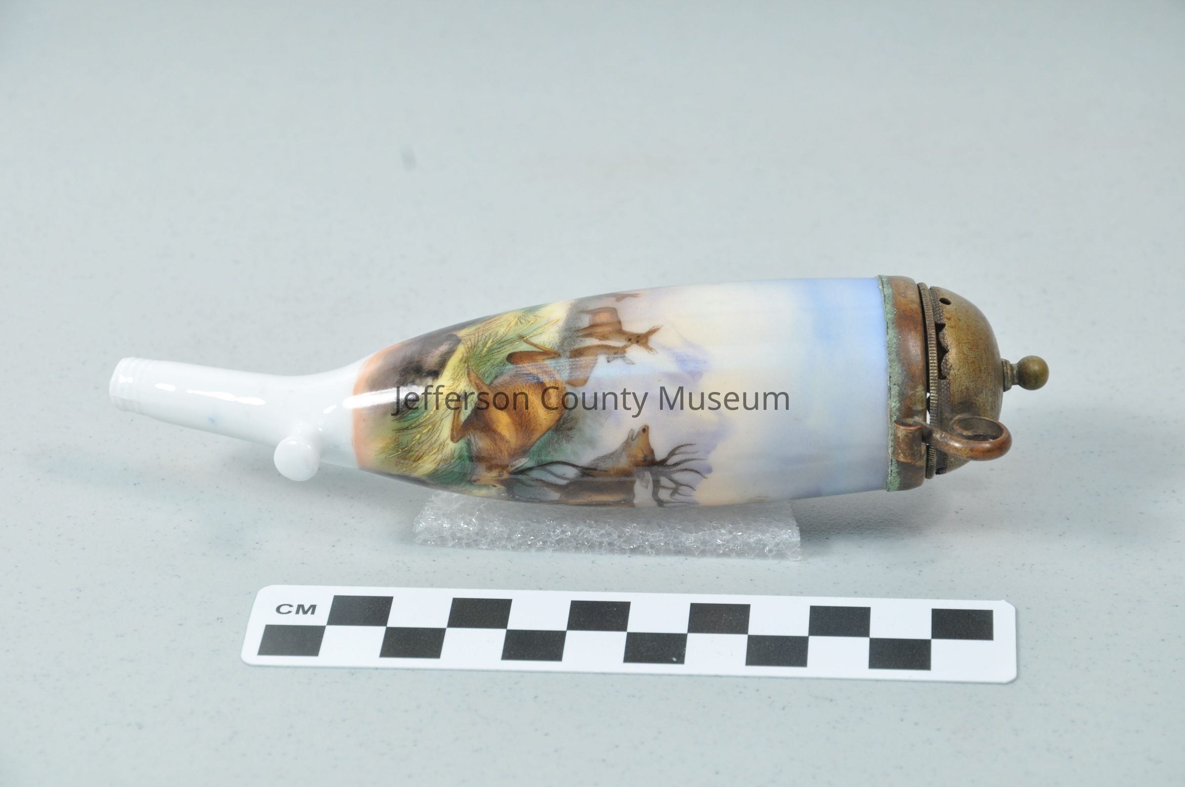 Elaborate German pipe with white porcelain bowl and flexible stem. Bowl has painting of two male deer or hart with large antlers and three females with mountains in background. Hinged metal cap on bowl with small ball finial and curled handle. Pipe detaches into five or six pieces.Acquisition