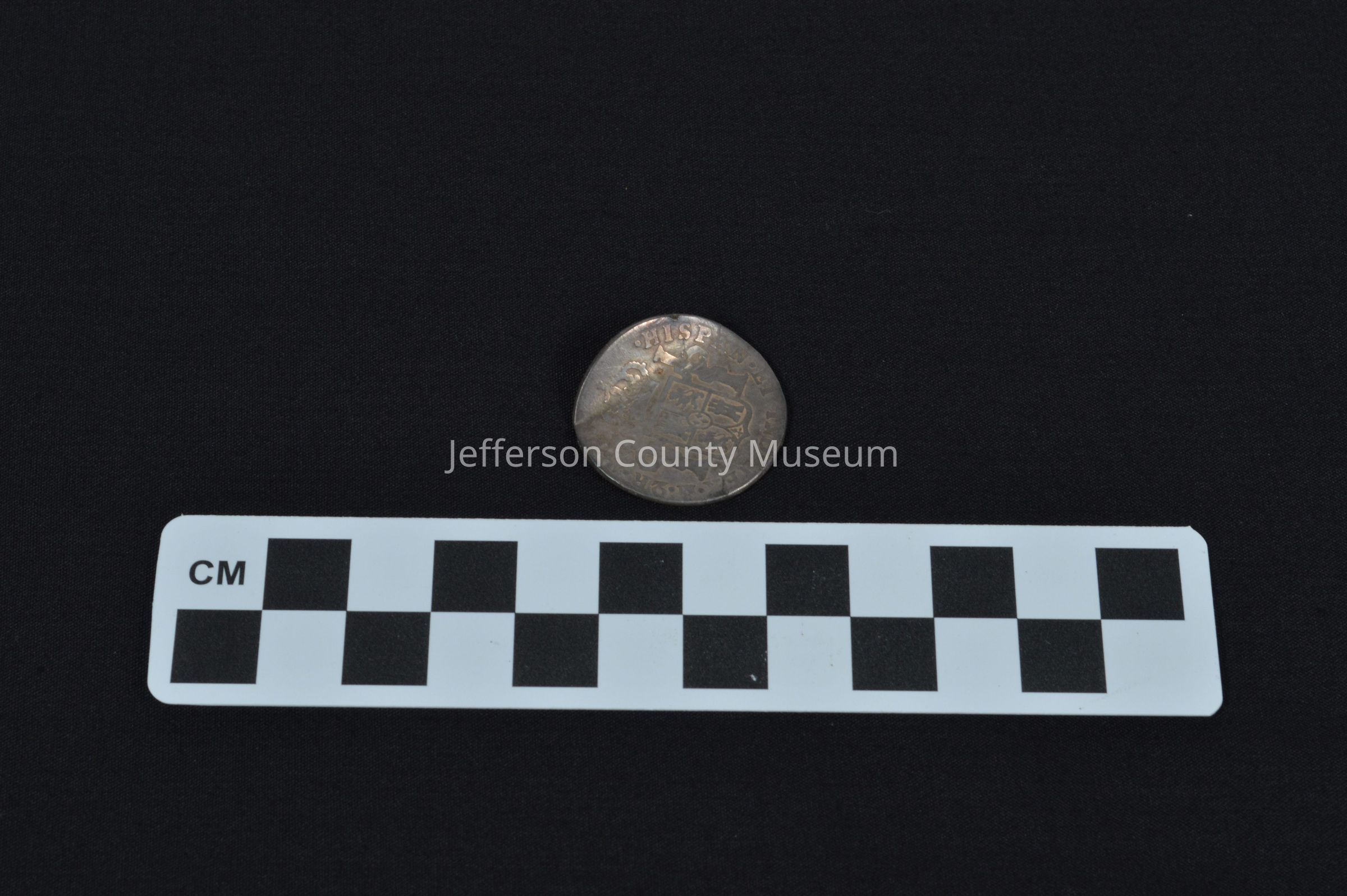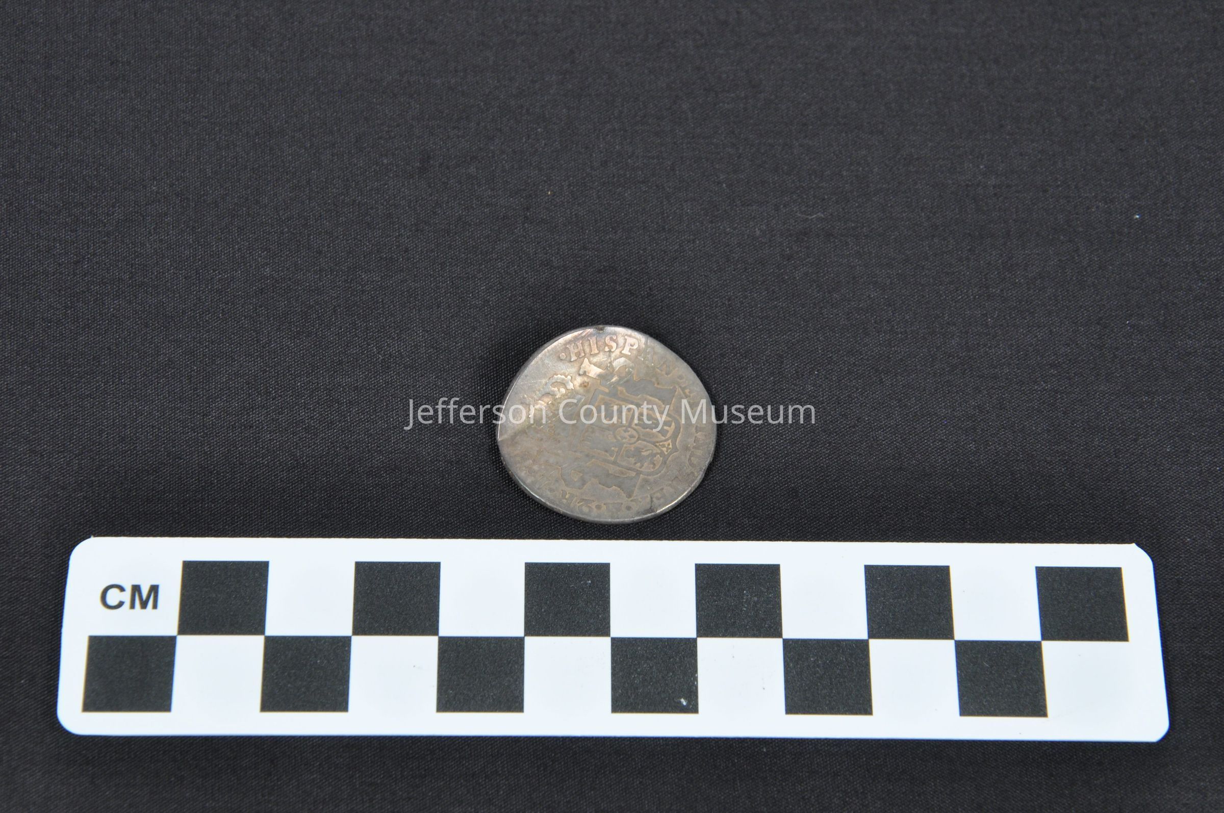 1808 two-real Spanish coin. Obverse has image of king. Around head "FERDIN VII DEI GRATIA 1808". Reverse has Spanish coat-of arms with "HISPAN . ET . IND . MEX . M . 2R . T . H".Acquisition