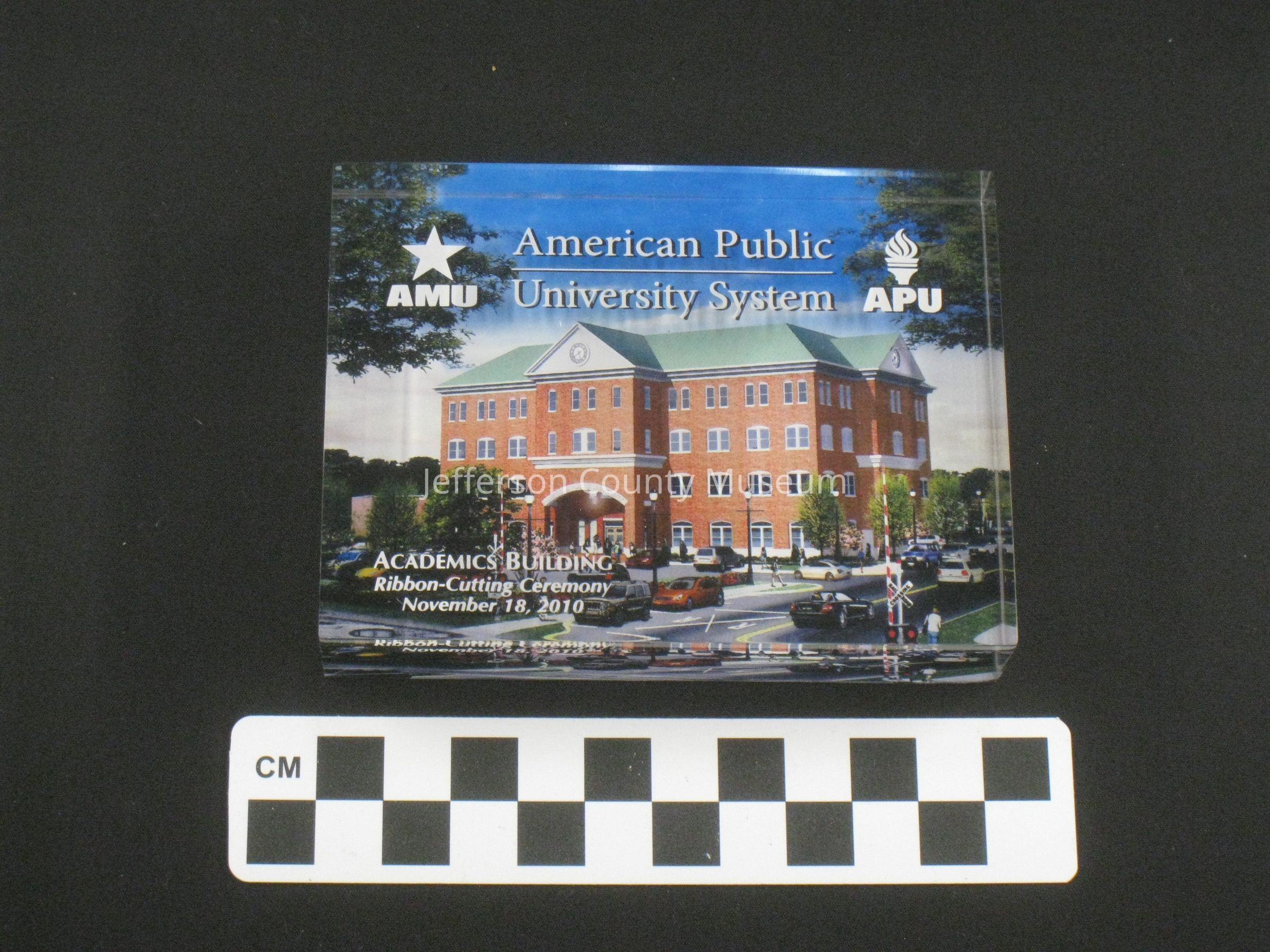 Lucite paperweight commemorating the ribbon-cutting ceremony for American Public University System's Academics Building. Artist's rendition of building with cars crossing railroad tracks in front of building is embedded in lucite. At top on left is a star with "AMU" below it. Centered at top is "American Public University System". At top on right is a torch with "APU" below it. At bottom left is "ACADEMICS BUILDING Ribbon-Cuttin Ceremony November 18, 2010".Acquisition