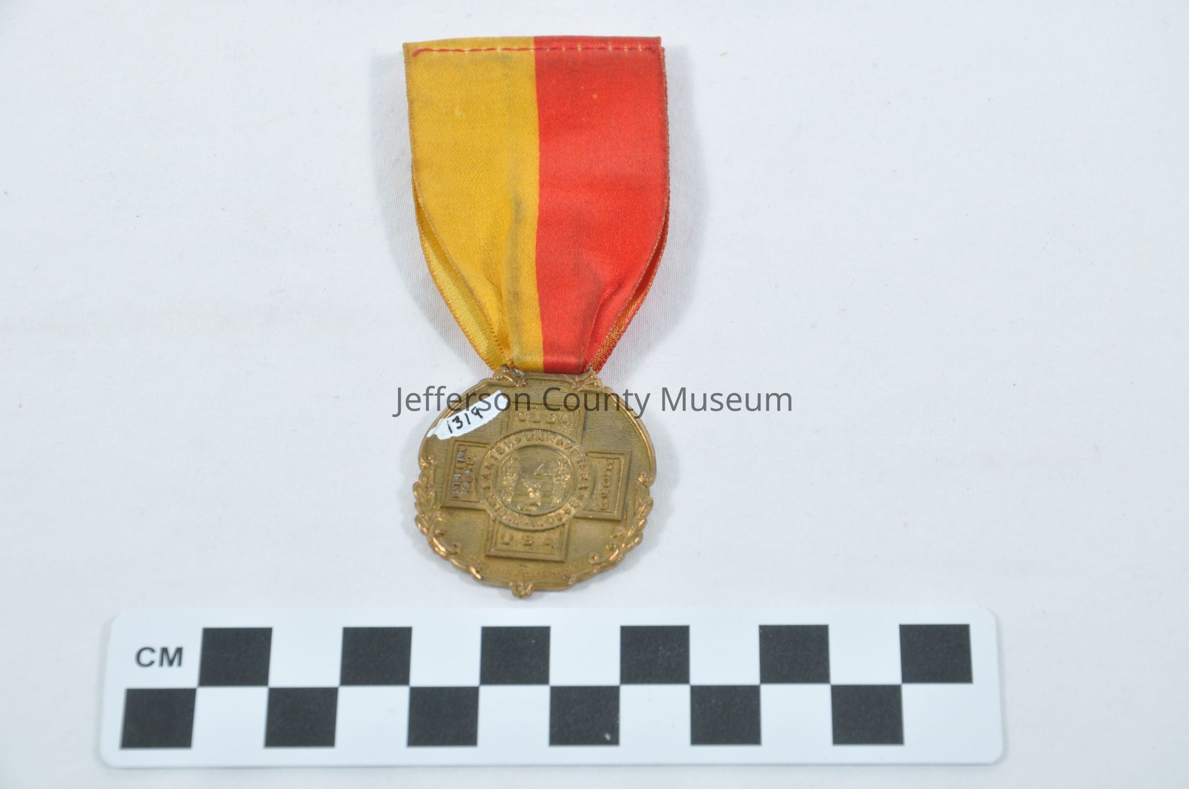 Red and yellow ribbon and round medallion. Ribbon says "DELEGATE 33RD NATIONAL ENCAMPMENT U.S.W.V. NEW ORLEANS 1931". At top of medal "ST. LOUIS CATHEDRAL CABILDO PRESBYTERE". On side of medal "NEW ORLEANS SEPT. 6-10 1931". At bottom "THE CRESCENT CITY". In center are three steepled buildings with a monument of a man on a horse in front of buildings. On back is cross with "CUBA" on top arm, "PORTO RICO" on right arm, "U.S.A." on bottom arm and "PHILIPPINE ISLANDS" on left arm. Around center of cross is a circle with "SPANISH WAR VETERANS 1898-1902". Three figures in center with a ship in background.Acquisition