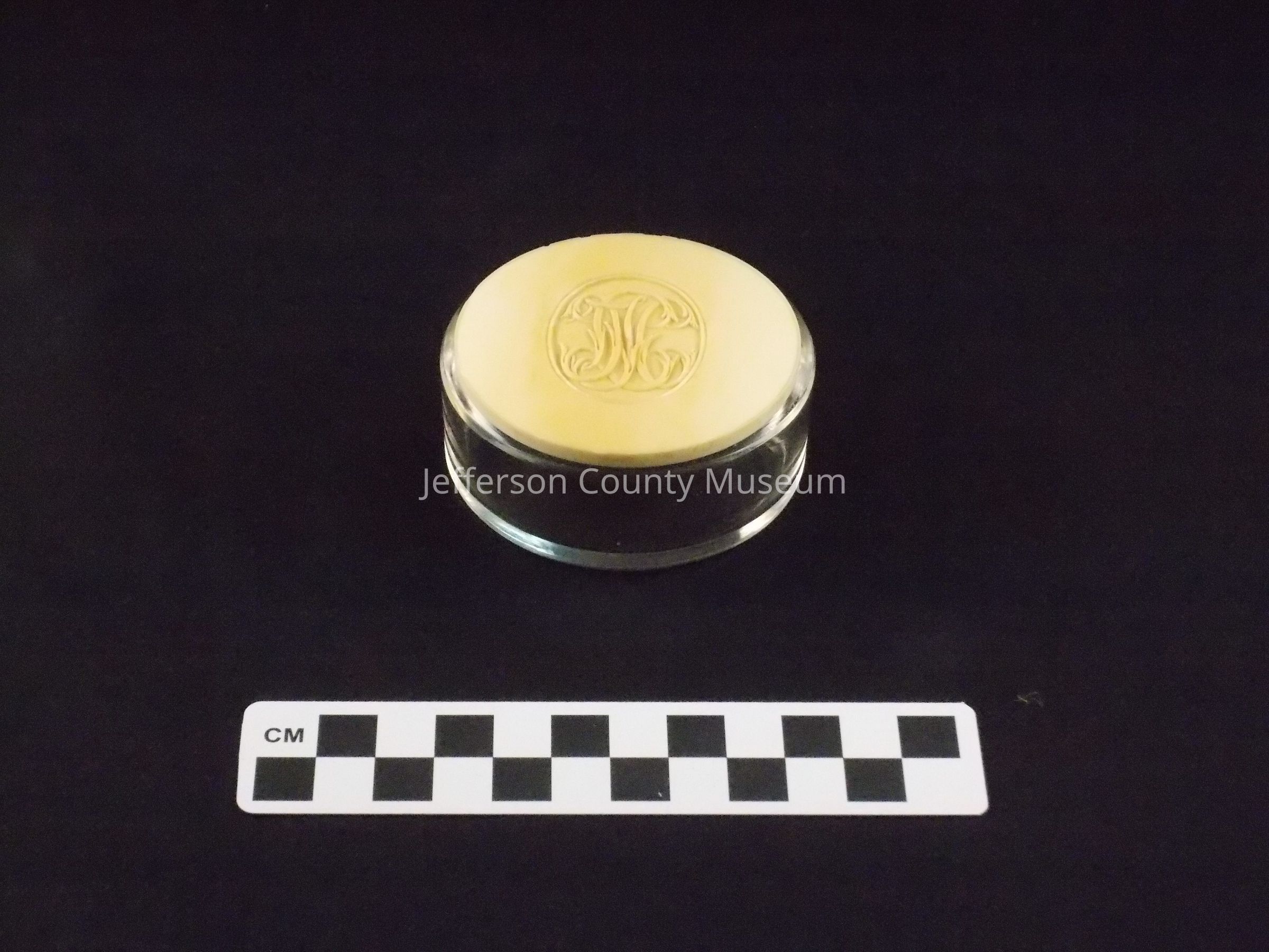Round glass cosmetic box with ivory lid. Fancy script "HLJ" on lid for Harriet Lane Johnston. Lid is 1323a and box is 1323bAcquisition
