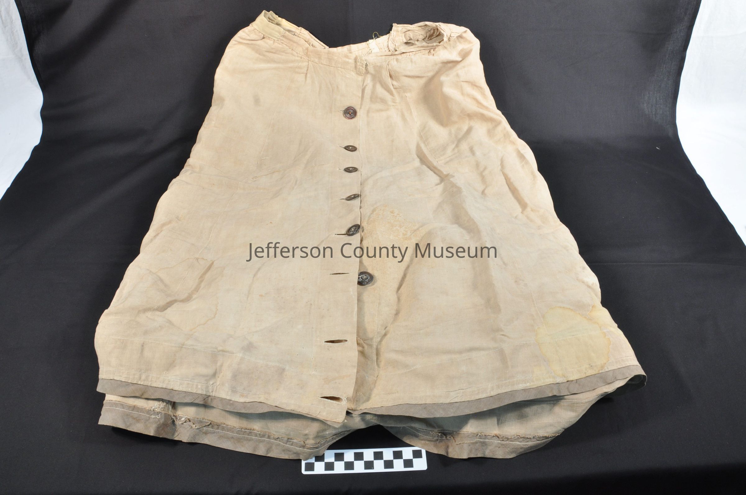 Cotton tan colored three piece dress. Top is fitted at waist and has long sleeves. Large buttons and hook and loop closure down front. Top is decorated with darker brown stripes down front, around bottom and end of sleeves. There is dark brown piping down sleeves and on back. Skirt has three dark brown stripes on bottom, one larger than the other two. Petticoat or underskirt has large buttons down front and dark brown stripe around bottom.Acquisition