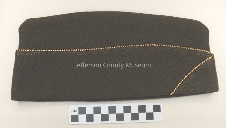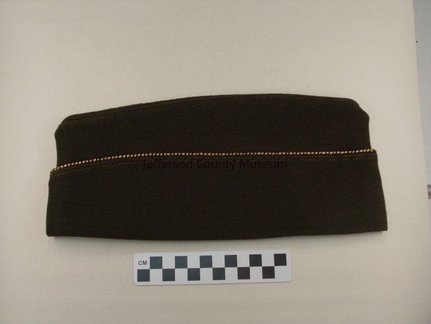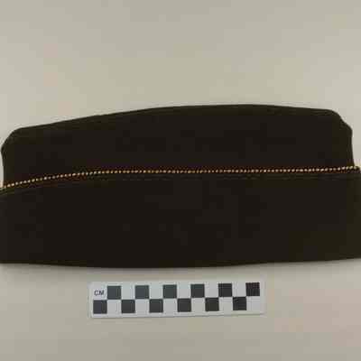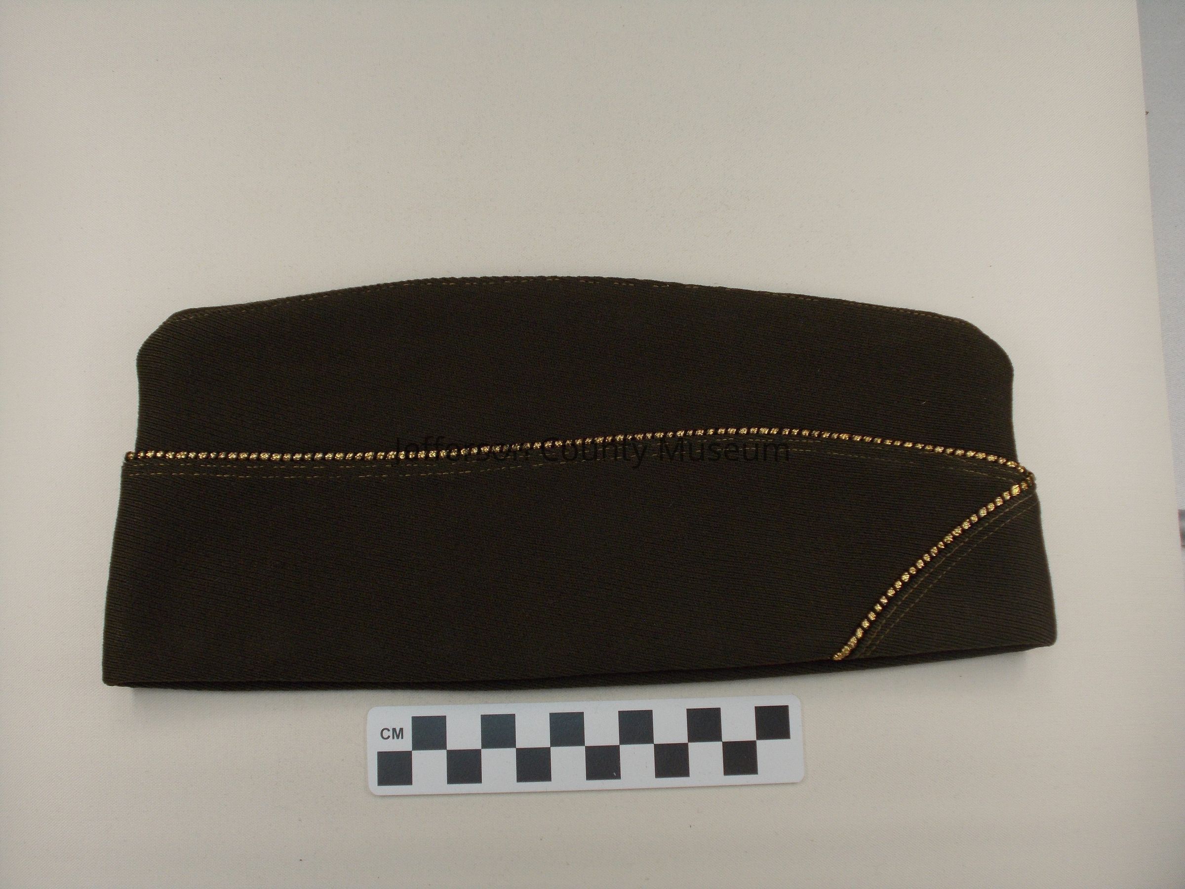 World War II dark brown officer's overseas garrison cap with gold piping. A cloth tag is stapled to the sweat band inside with "Th 14290" on it. Hat has yellow lining.Acquisition
