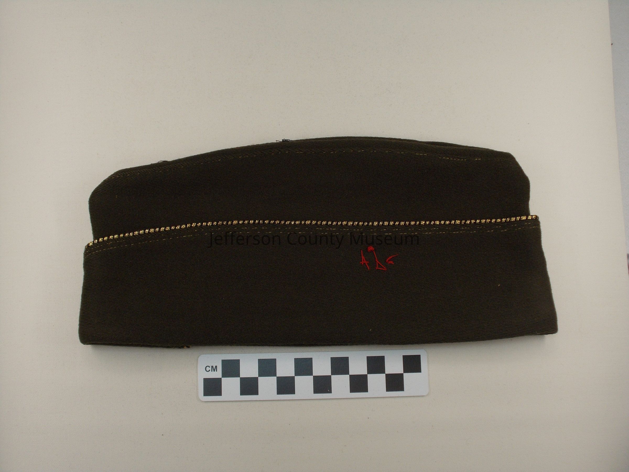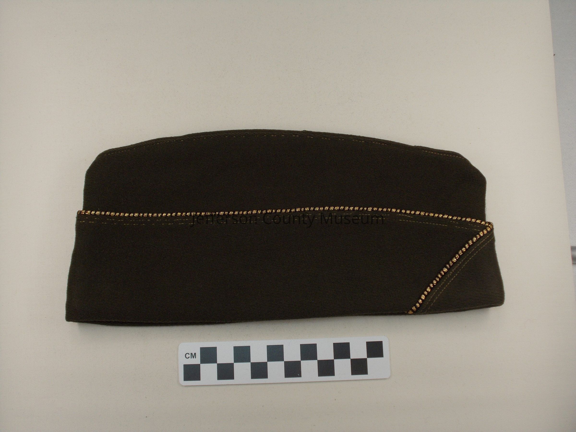 World War II dark brown officer's overseas garrison cap with gold piping. There are red threads sewn on left side. No other markings. Yellow lining.Acquisition