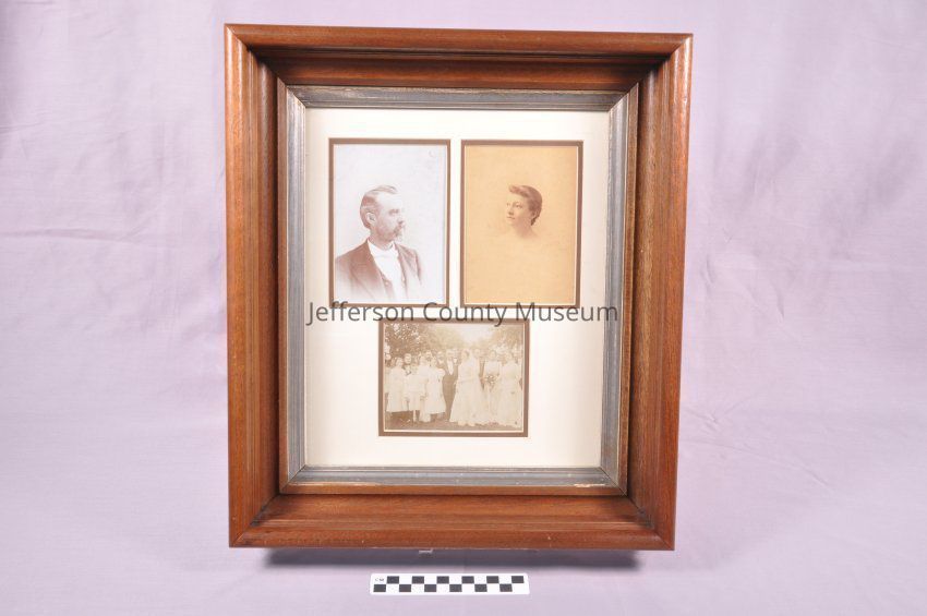 Three photographs mounted in a shadow box: individual photographs of Elizabeth Ruth Taylor Moore and Gerard Davis Moore and a photograph from the wedding of Elizabeth to Gerard.