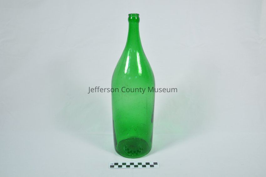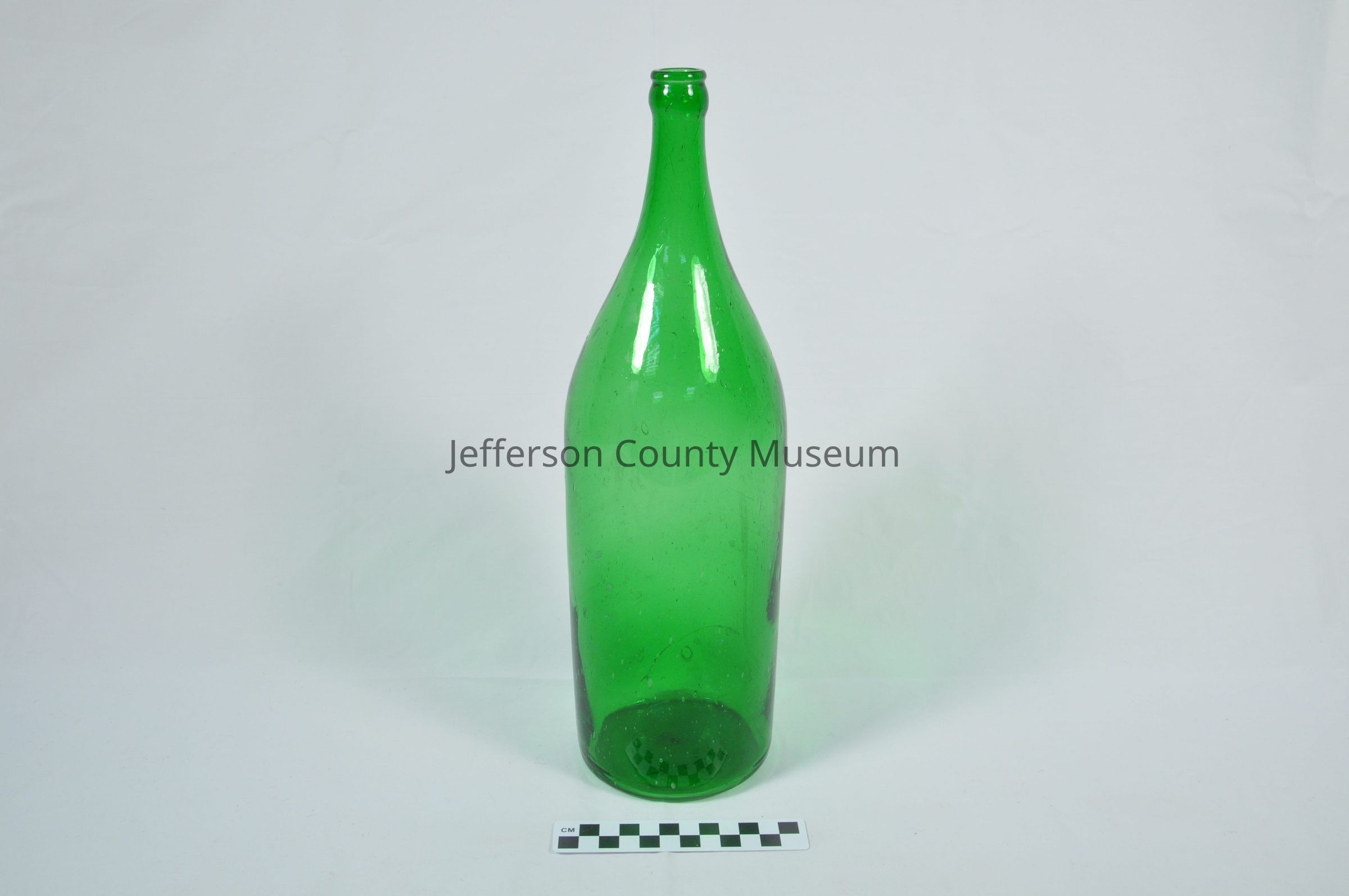 Large green glass beverage bottle with top for a modern pop-off cap. There are many bubbles in the glass. No markings.Acquisition
