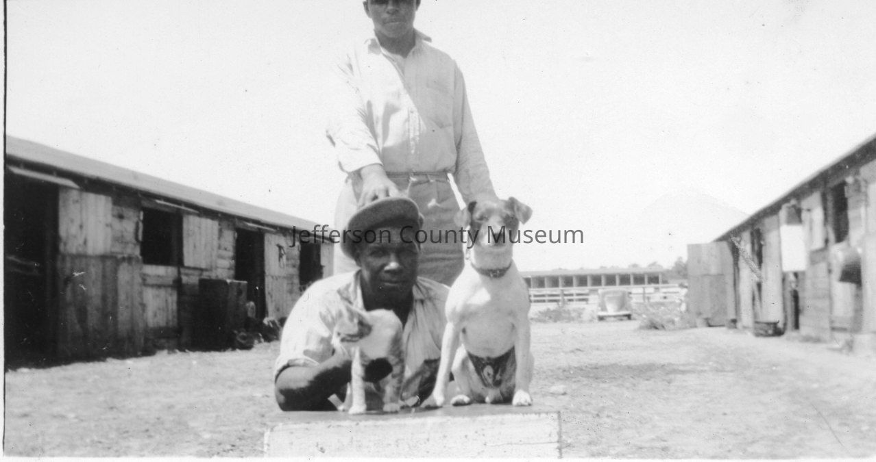 Eight photographs taken at an unidentified race track of stables, horses, African American and white workers, and a cat and a dog