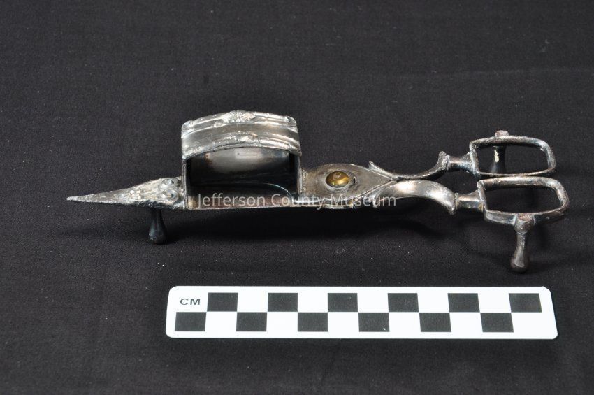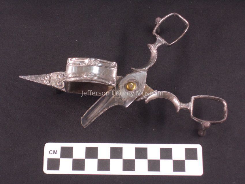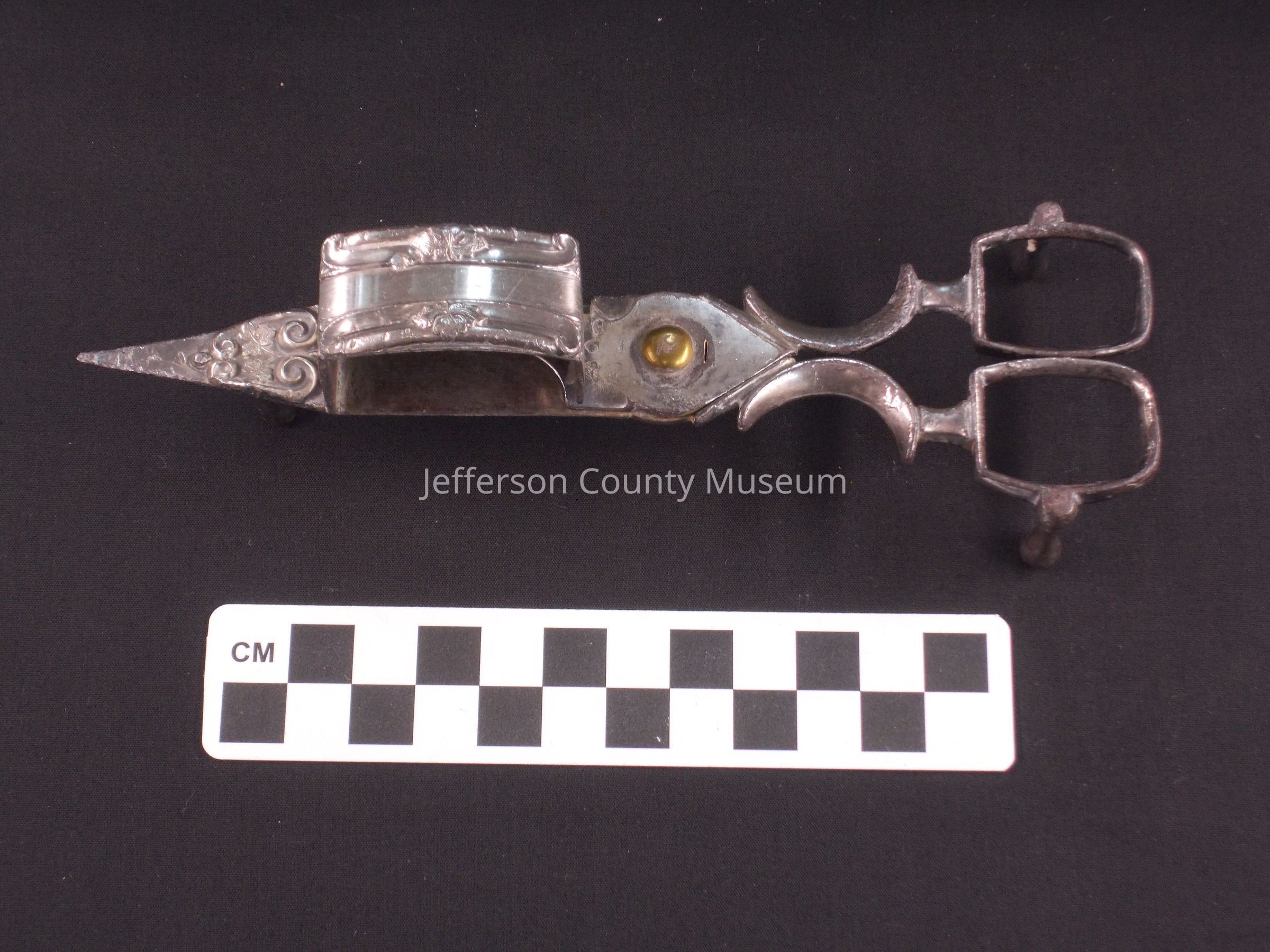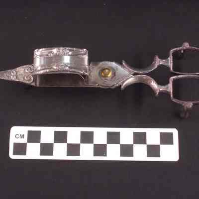 Silver plated wick trimmer made like scissors. The wick was held against the box shaped part and trimmed by squeezing the two parts together in a scissors action. The two pieces are held together with a brass pin with an acorn on its head. Has three small legs on which device stands.Acquisition