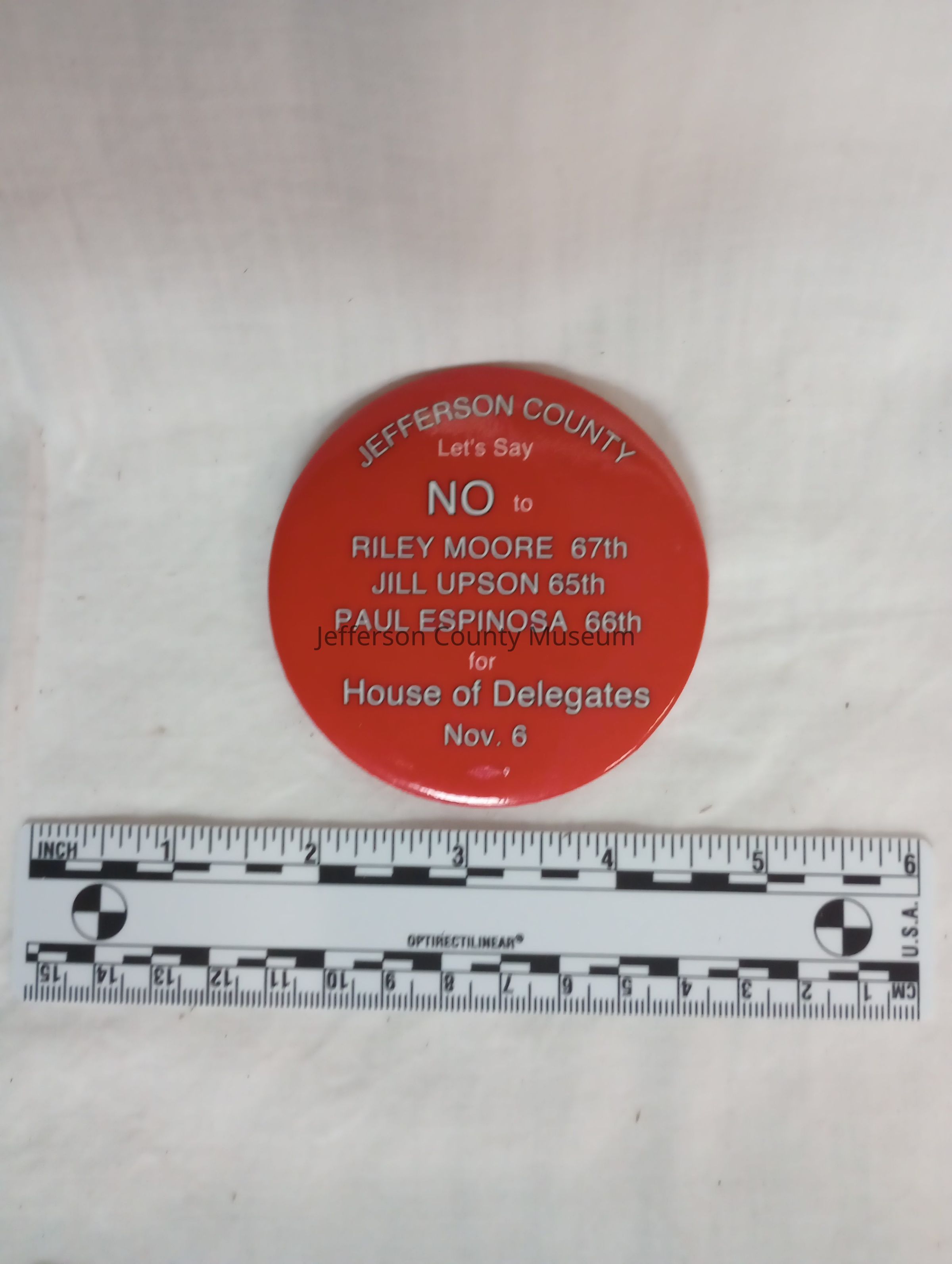 Red circular button with white text: "Jefferson County Let's Say NO to Riley Moore 67th Jill UPson 65th Paul Espinosa 66th for House of Delegates Nov. 6Context