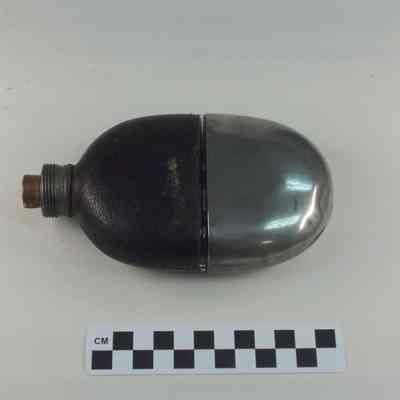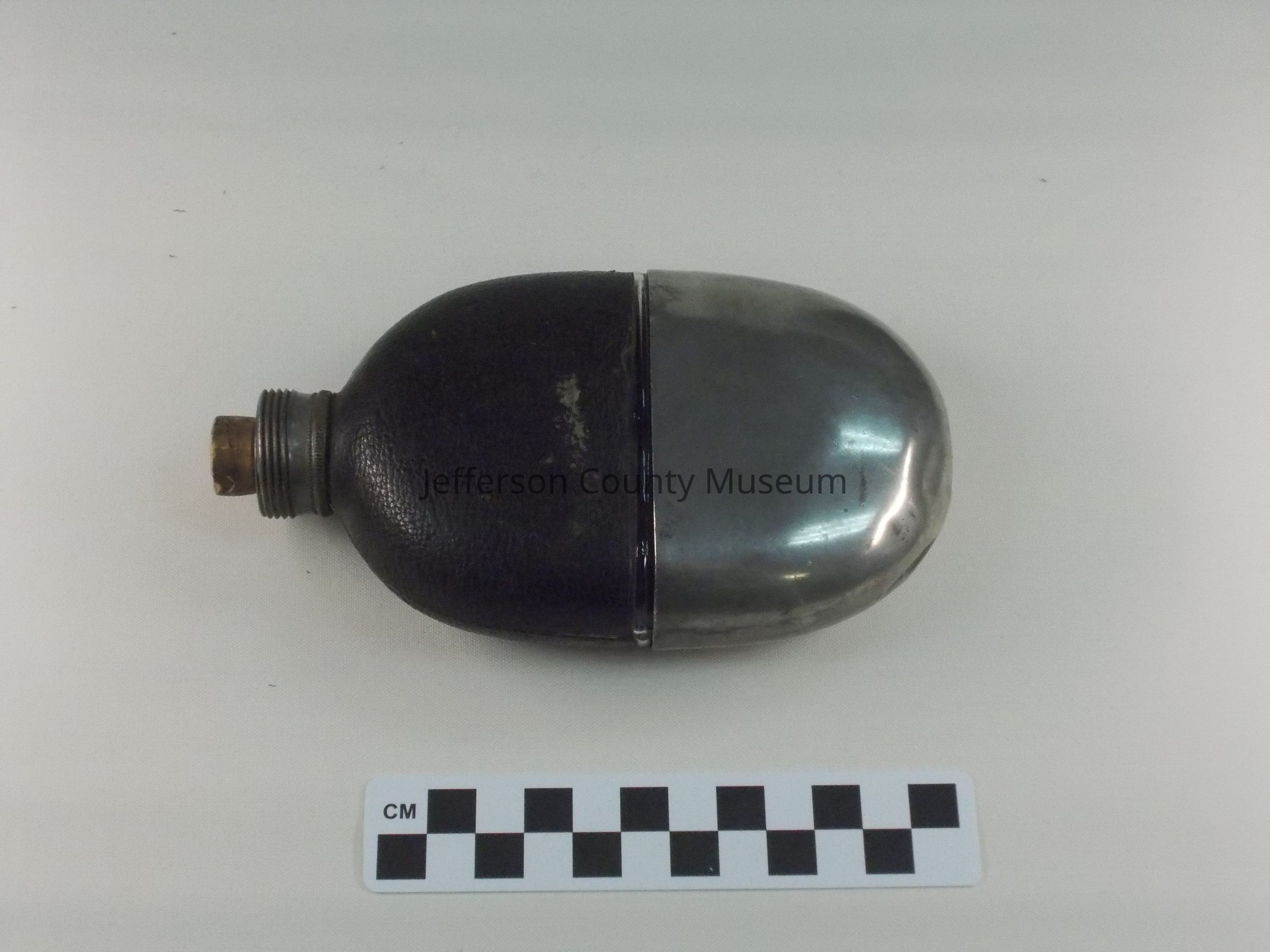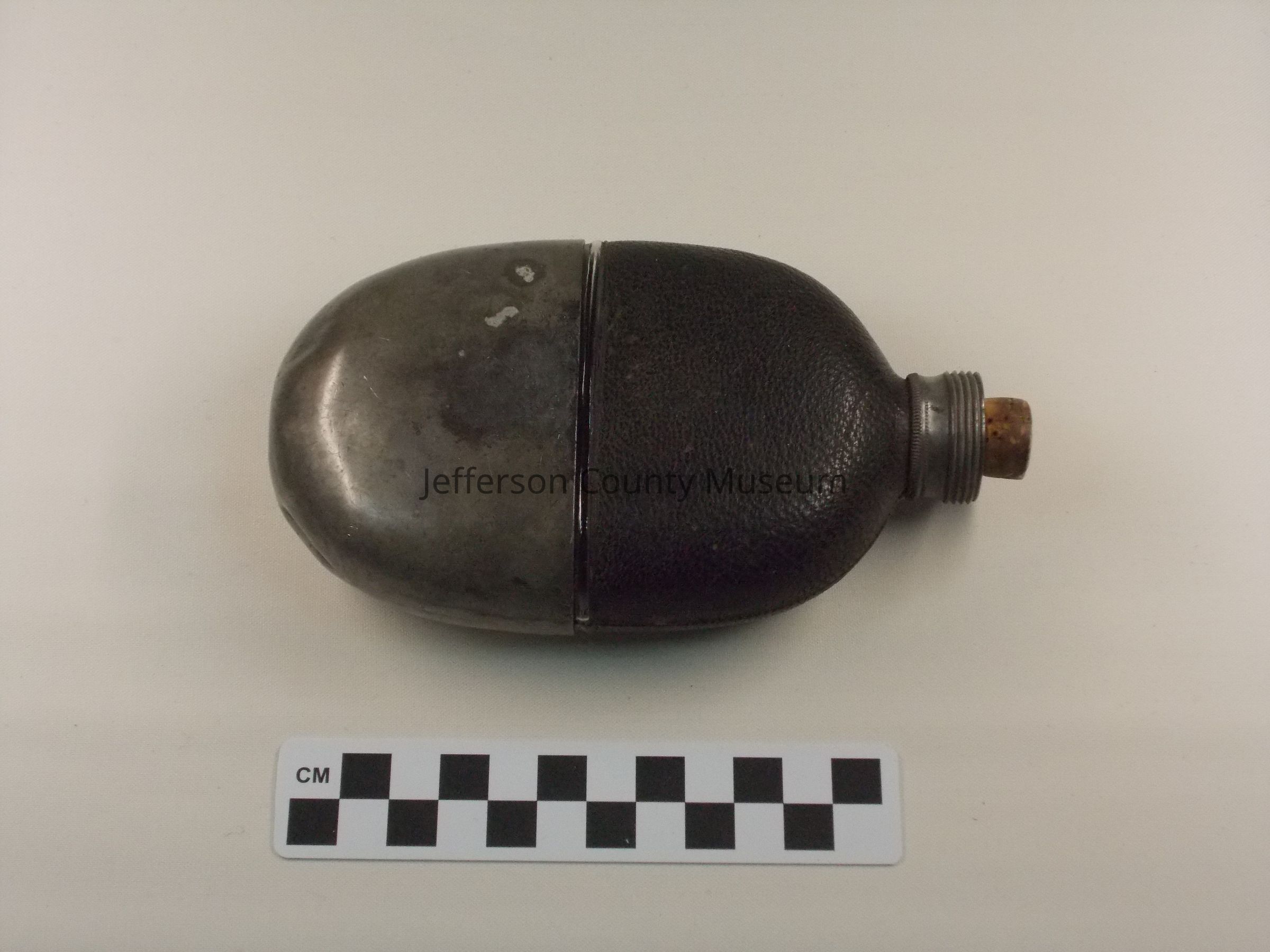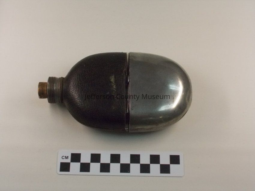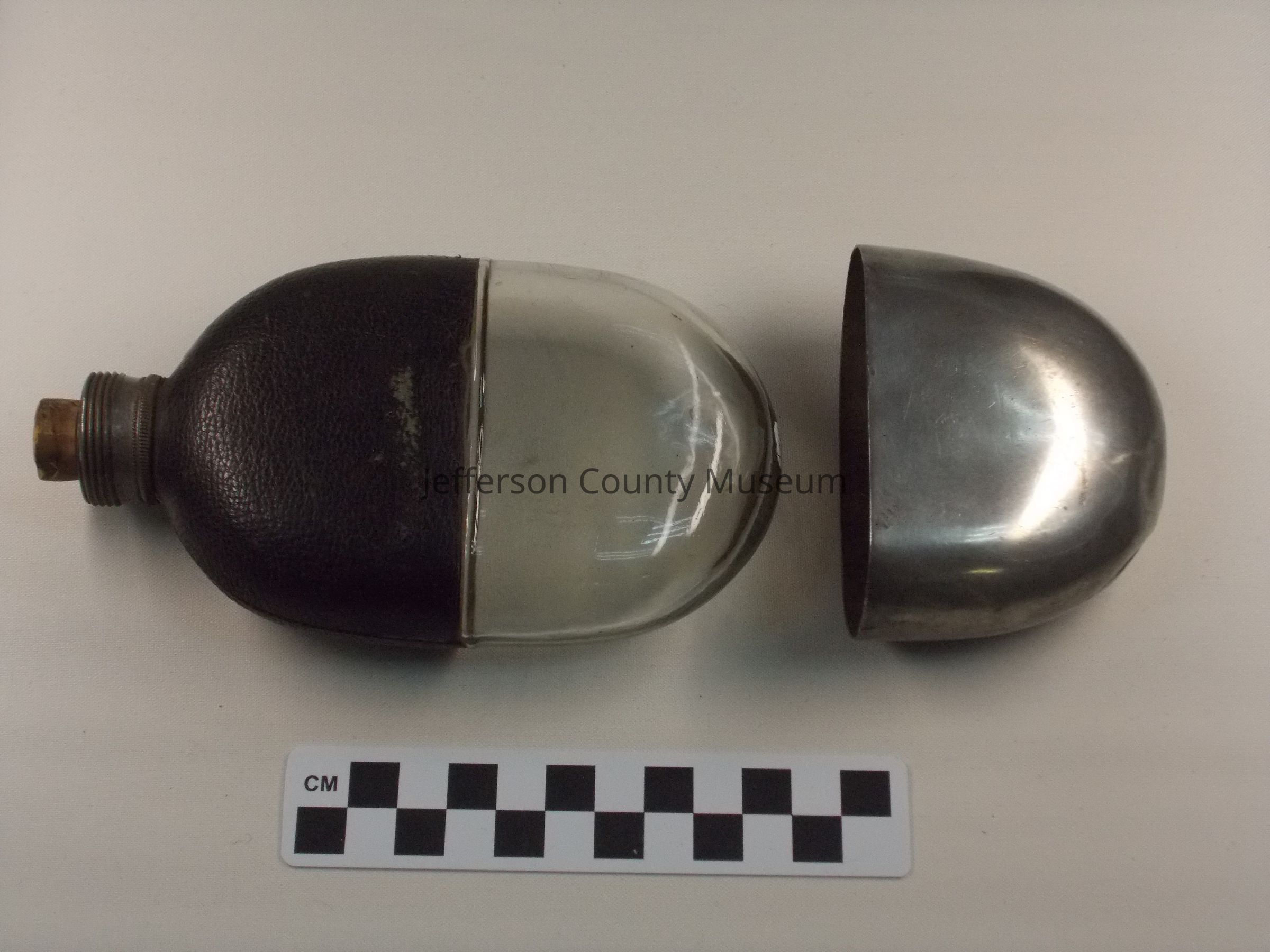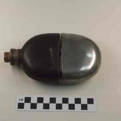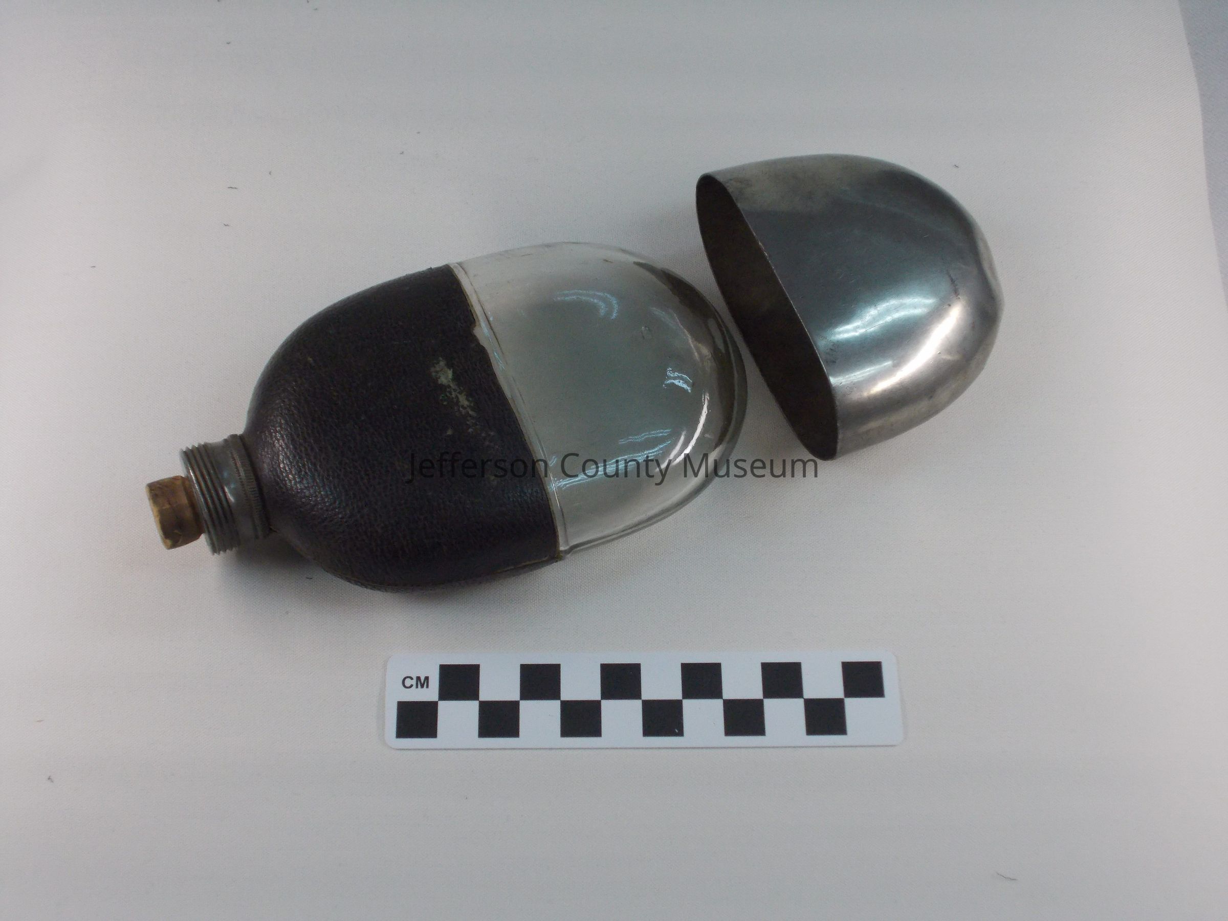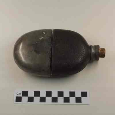 Glass flask with leather cover on top half. Metal lid with threads on outside. Screw top apparently missing. Cork in opening. Silver colored metal cover for bottom half. Around lid "M.V. OLRY'S PATENT SEPT. 25, 1866".Acquisition