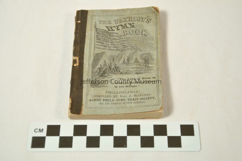 "THE PATRIOT'S HYMN BOOK" on cover above waving American flag and troops around pup tents. Compiled by the Rev. Andrew Manship and published by "THE PHILA. CONF. TRACT SOCIETY, No. 119 NORTH SIXTH STREET", 1862. Paper cover is a pale grey-green with black spine binding.Acquisition