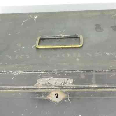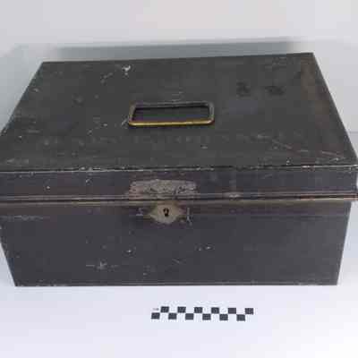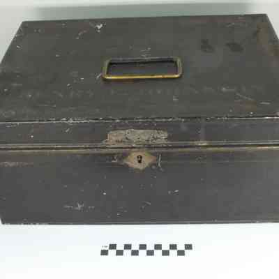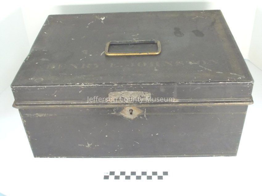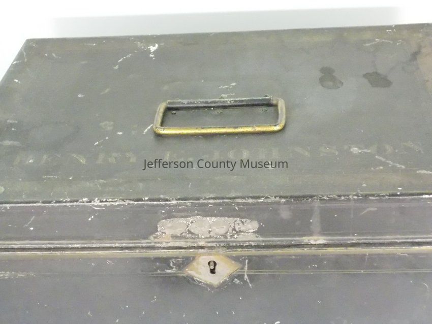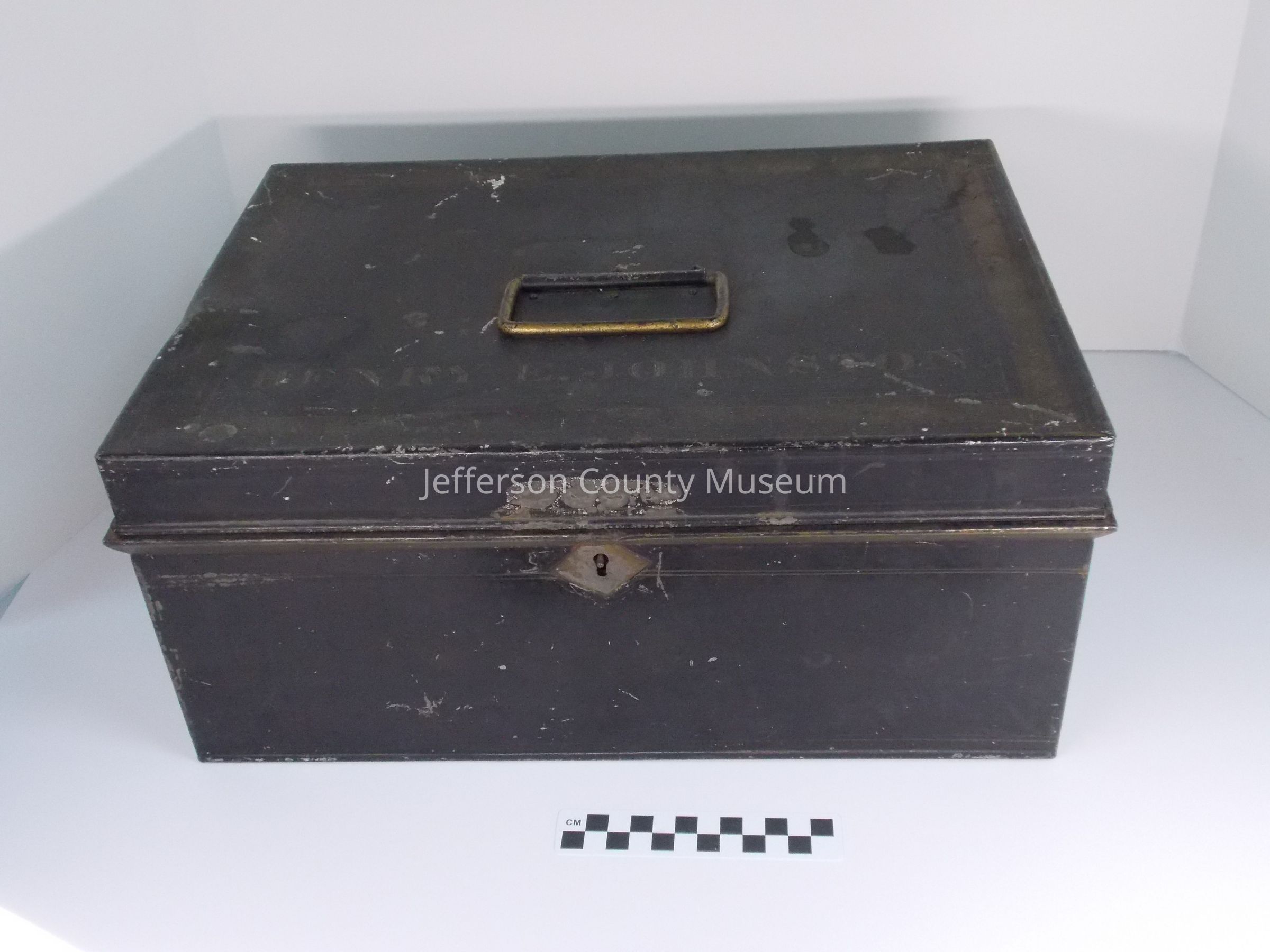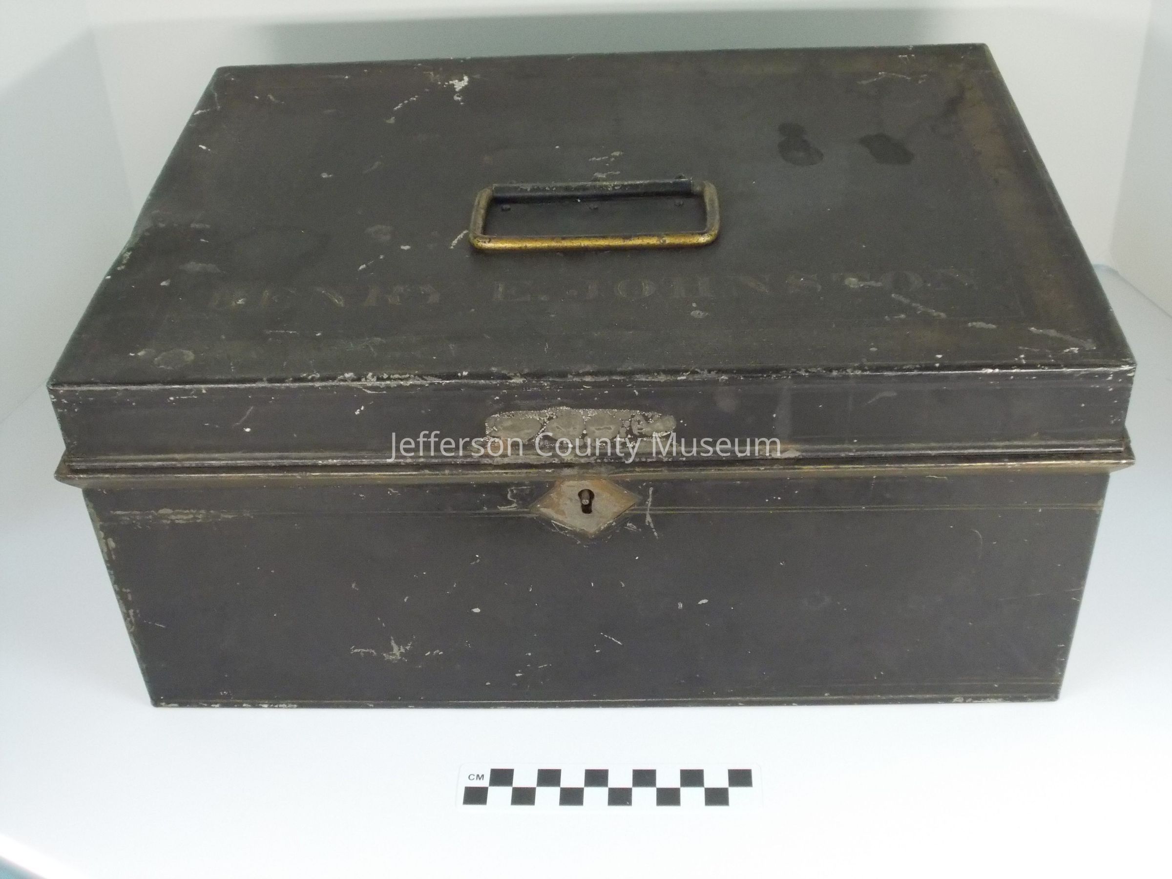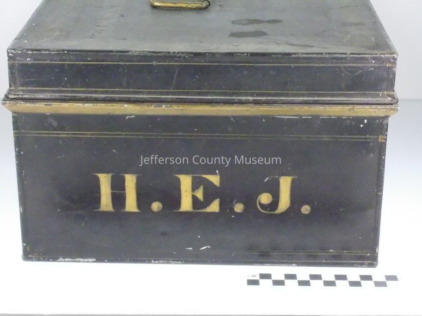 Japanned metal box with rectangular metal handle on top. Fading gold border around top and "HENRY E. JOHNSTON". Initials "H.E.J." on both sides.Acquisition