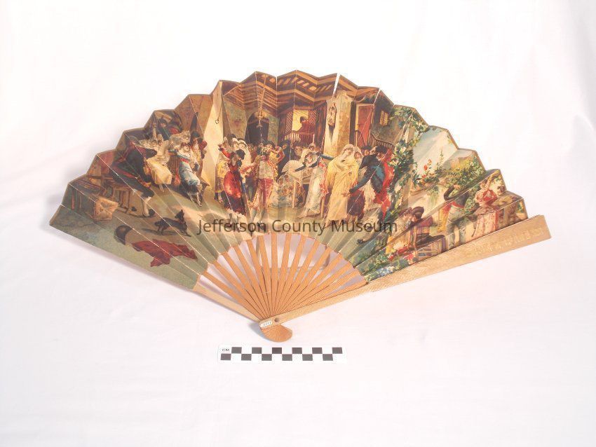 Paper and wood fan showing Spanish dancers with large group of people watching. One side of handle has word "RECUERD", other side has "'DE ESPANA".Acquisition