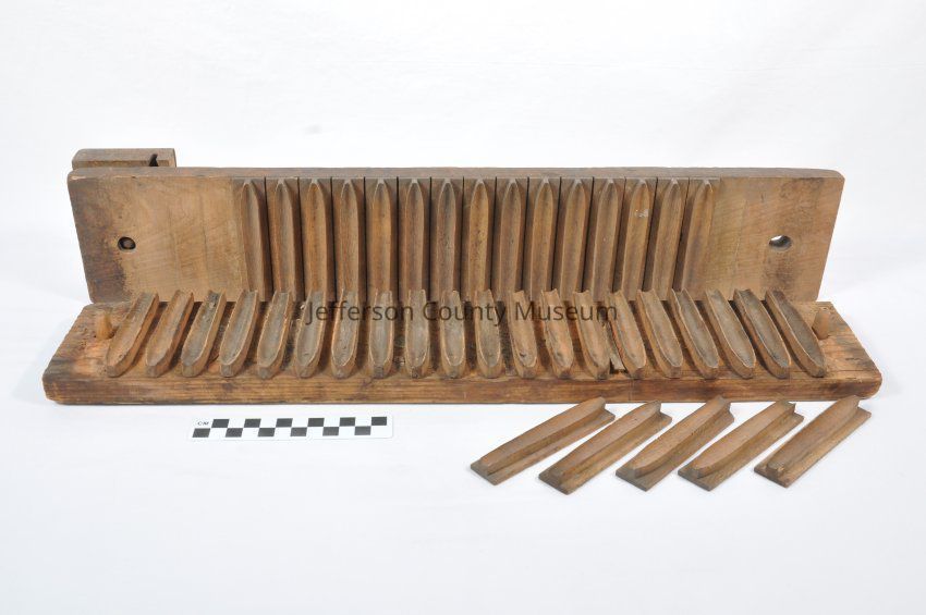 Wooden two-part cigar mold. Twenty molds for making cigars. Several pieces are loose.