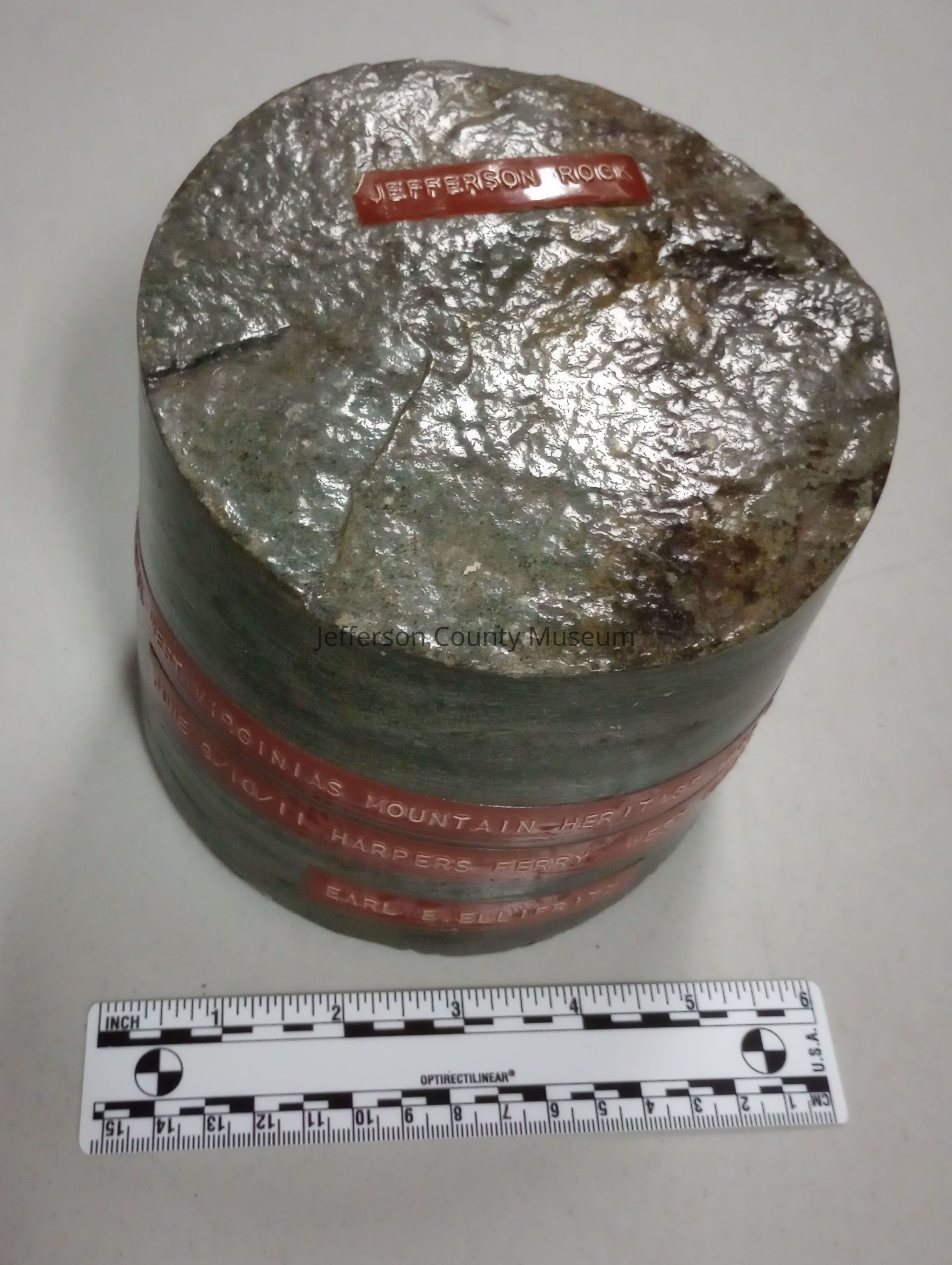 Cylindrical piece of gray rock with label on top saying "Jefferson Rock" and label on side saying "Wild Wonderful West Virginias Mountain Heritage Arts / Crafts Festival June 9/10/11 Harpers Ferry West Virginia 1972 Earl E. EllifritzContext