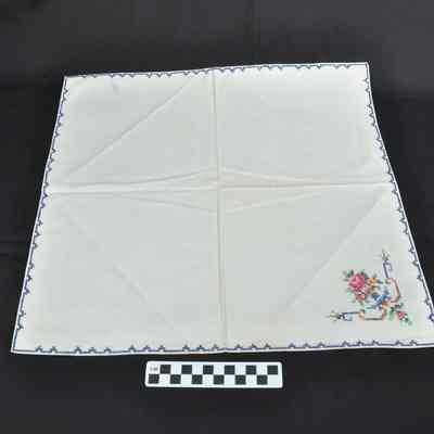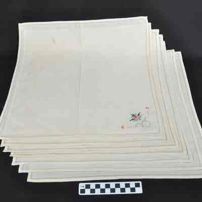 Collection includes 12 napkins and one doily. Eleven of the napkins are off-white and have green, pink and red embroidery in one corner. One is off-white toward yellow with blue embroidery around edge and blue, green, brown, pink and yellow embroidery design in corner.Acquisition