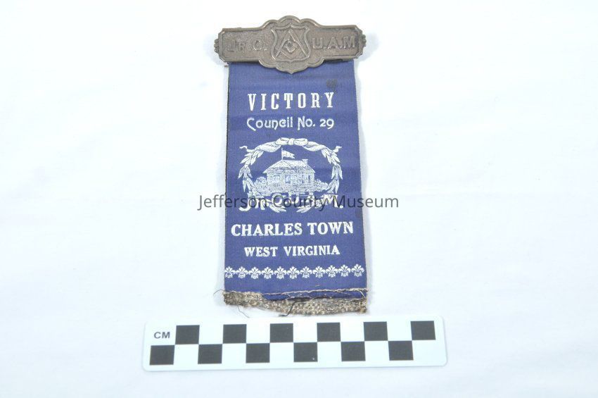 Bar at top has Masonic symbol in center and "Jr. O. U.AM." Blue side says "VICTORY Council No. 29 JR. O.U.AM. CHARLES TOWN WEST VIRGINIA". Black side says "In Memoriam VICTORY Council No. 29 JR. O.U.AM. CHARLES TOWN WEST VIRGINIA". On each side is a log building with flag flying over it and wreath surrounds it.Acquisition