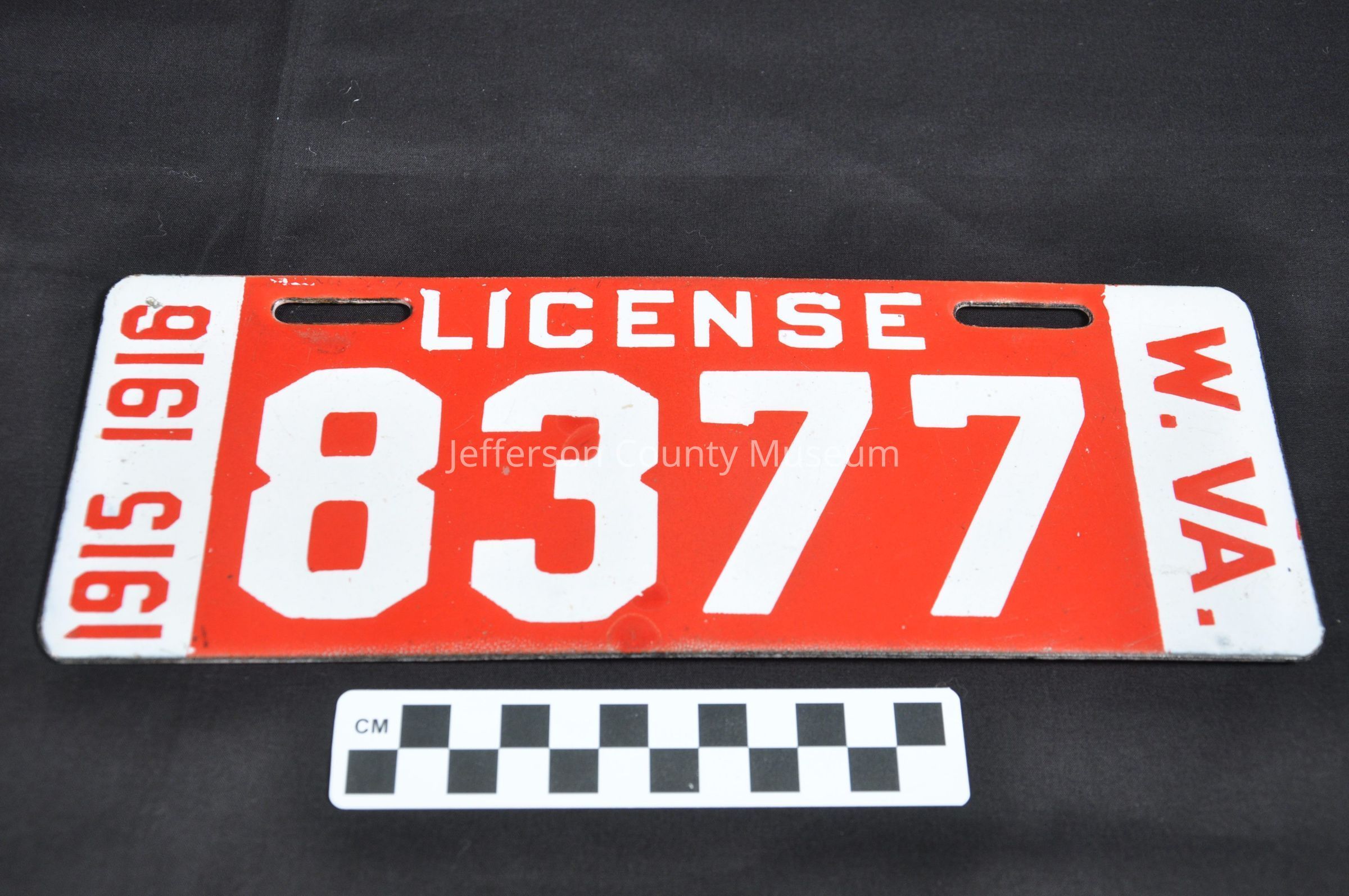 White numbers on red enamel marked on left "1915 1916", in center "LICENSE 8377", on right "W. VA".Acquisition