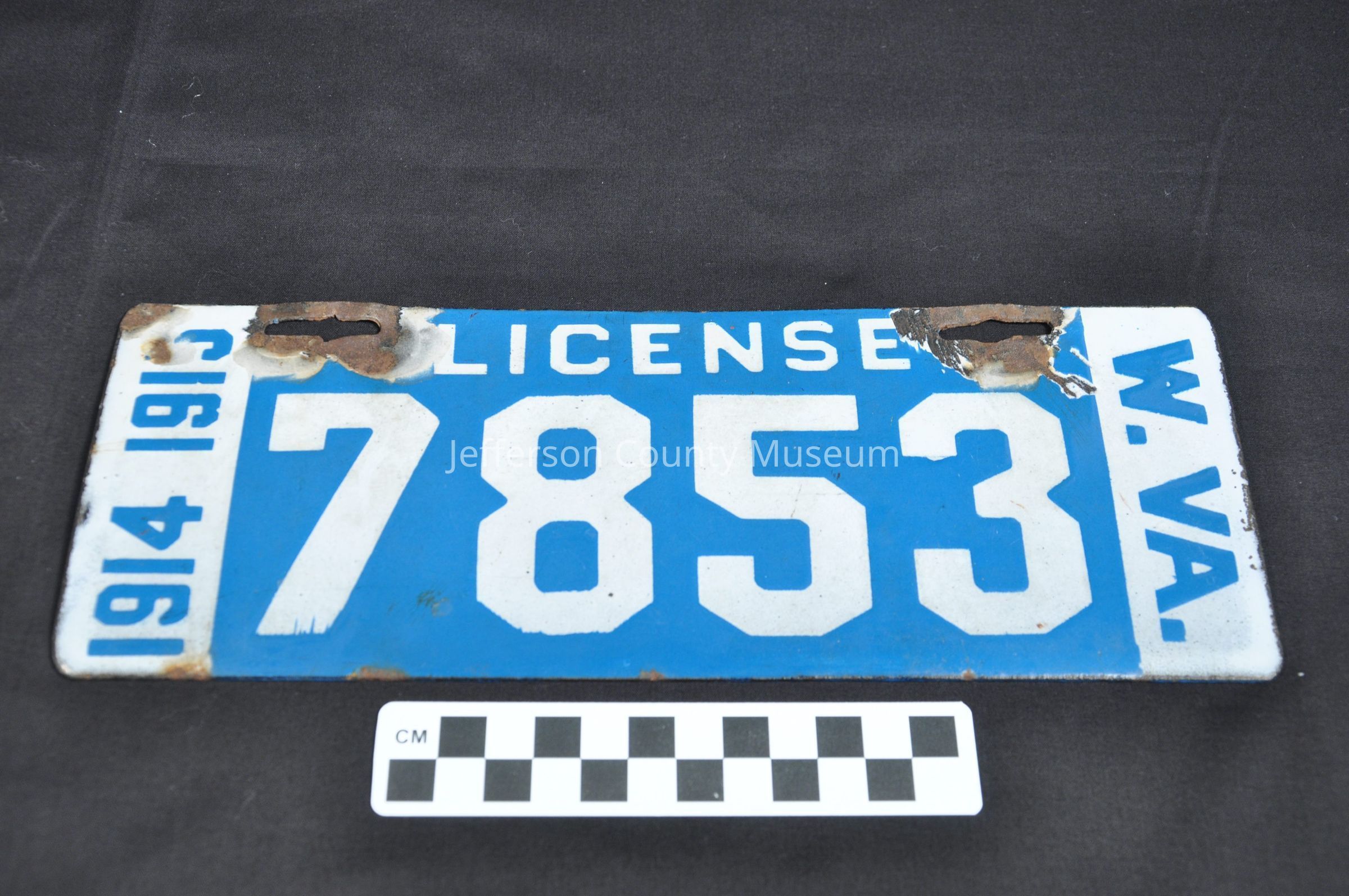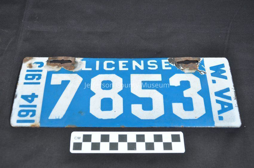 White numbers on light blue enamel with light blue on white on sides marked on left "1914 1915", in center "LICENSE 7853", on right "W. VA."Acquisition