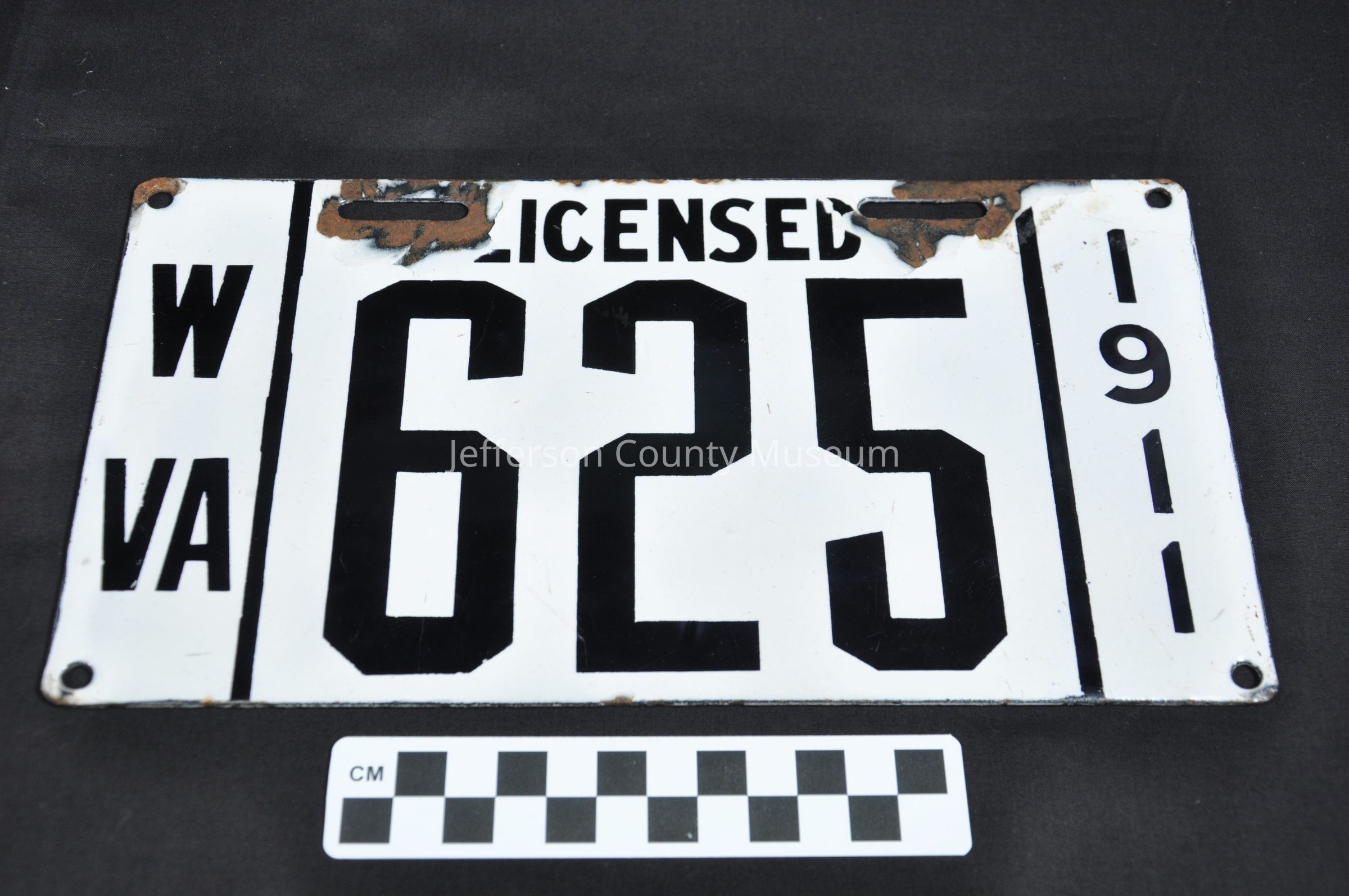 Black numbers on white enamel marked on left "W VA", in center "LICENSED 625", on right "1911".Acquisition