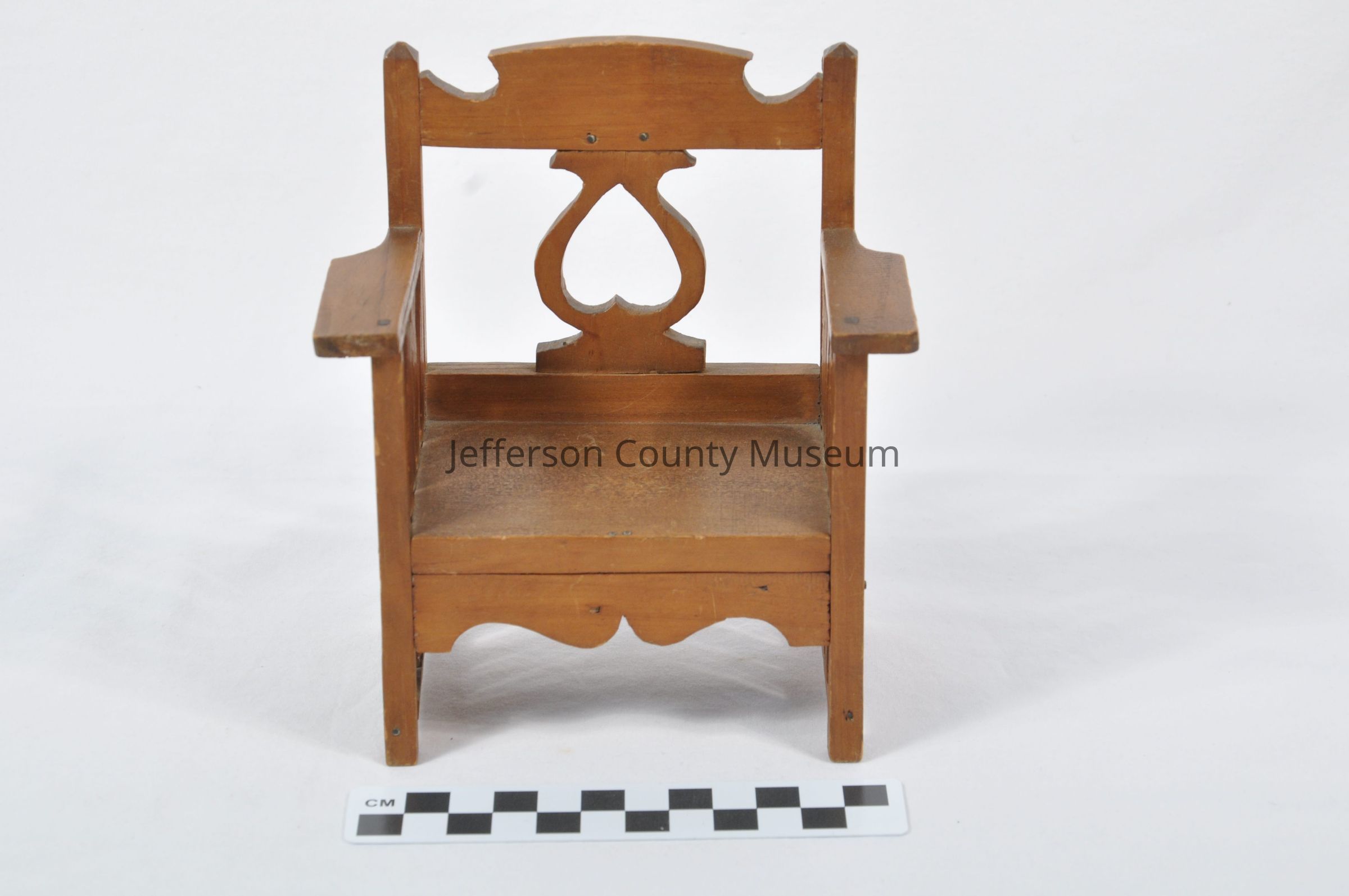 Wooden handmade doll chair. Back has upside down heart shape on back. Four slats on each side.
