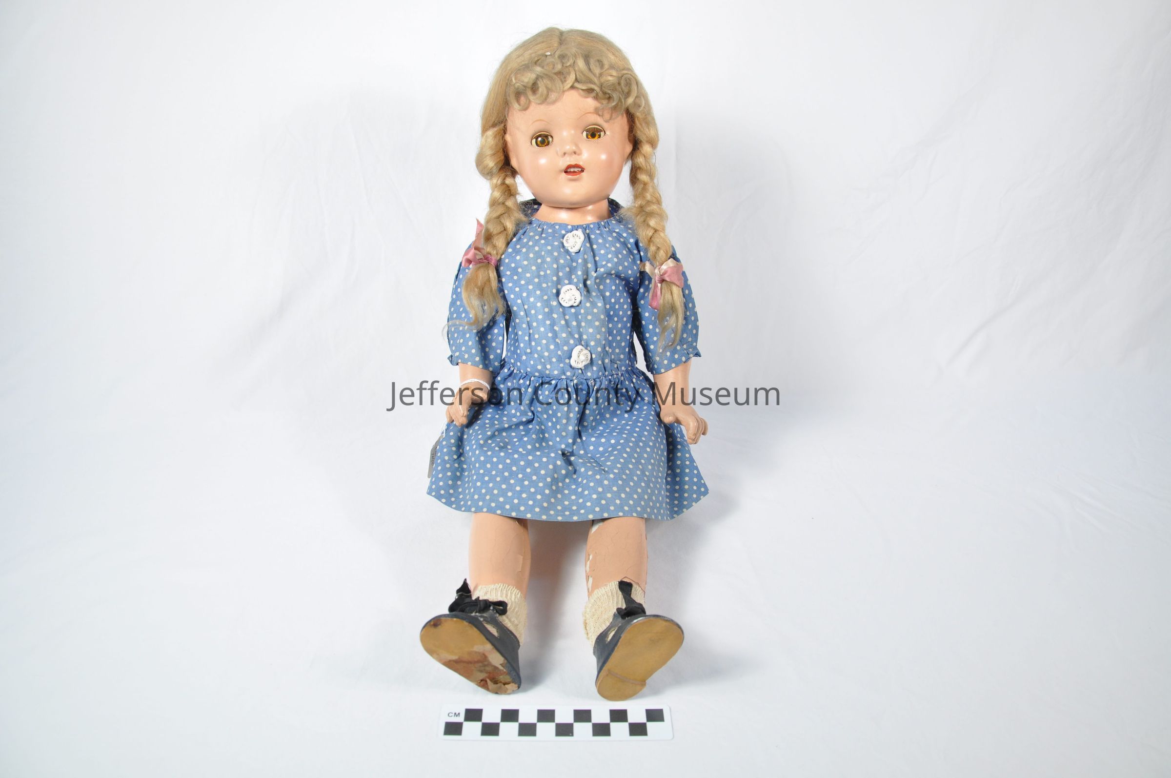 Composition female doll with eyes that close when doll is reclining and blonde hair with braids and pink and white ribbons. Body is wearing faded blue dress with small white polka dots and three white buttons on front, slips and pantaloons, and black shoes with socks that were probably once white.Acquisition